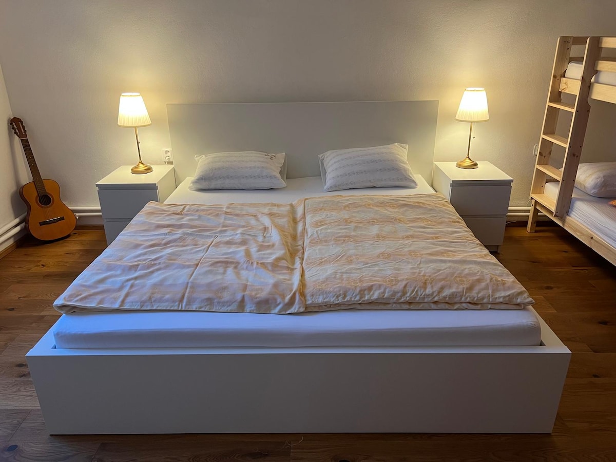 Sumérgete en la magia de cien años de historia en nuestro apartamento, que se encuentra en Hlušovice, cerca del estanque, en un pintoresco pueblo a solo 10 minutos del centro de Olomouc. Ofrecemos una acogedora sala de estar con una cocina totalmente equipada, cuatro cómodos dormitorios, dos baños modernos, una terraza con asientos al aire libre y un gran jardín. Ideal para familias con niños, así como para huéspedes exigentes que valoran el espacio y un mayor nivel de comodidad.