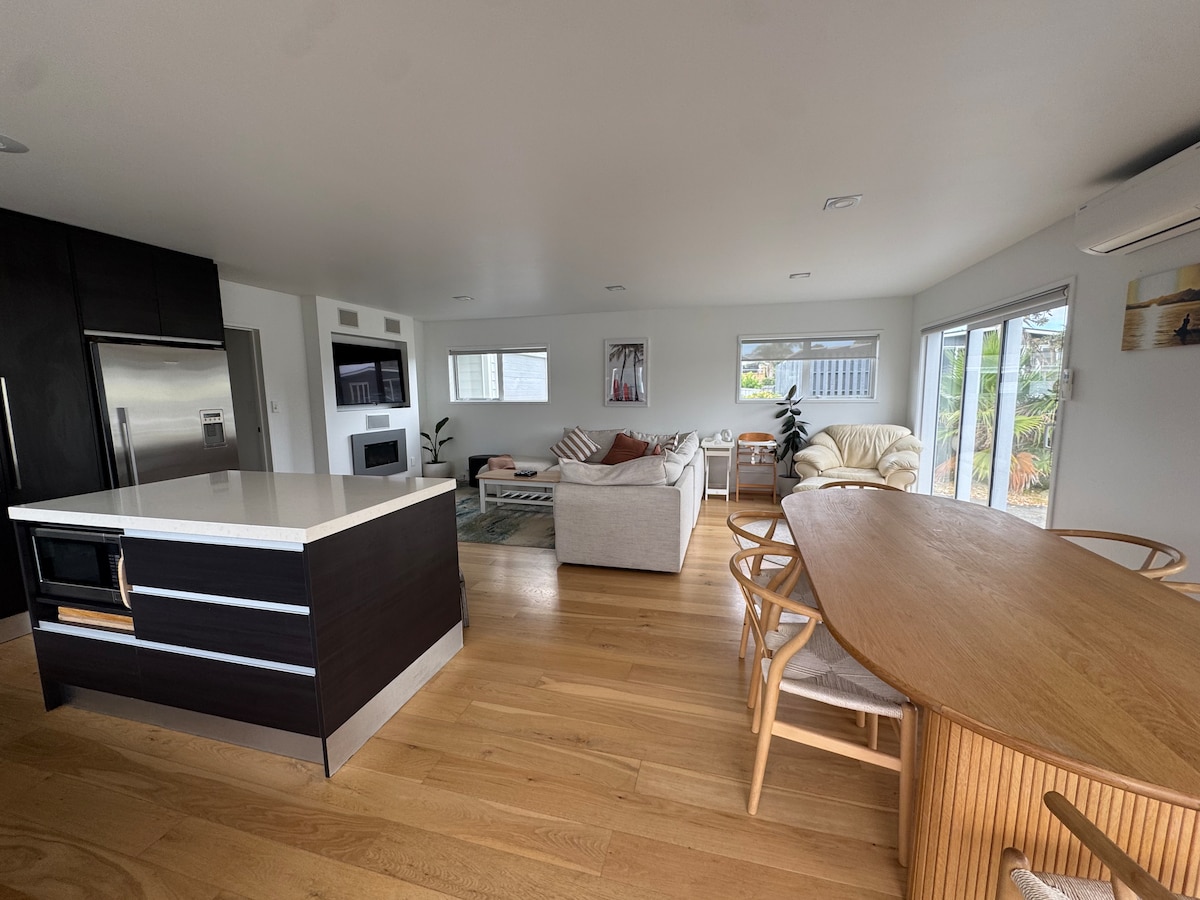 Come stay at this family-friendly home and luxuriate in the private spa! It Includes an infrared sauna, ice bath, and a hot tub! Also comes with 2 paddle boards, 6 bodyboards, 2 cruiser bikes, a surfboard, and a kayak. The sleepout has its own bathroom, and is ideal for multigenerational families and big groups. Located only a 5 min walk to the estuary and a 5 min drive to Omaha and Matakana. One night stays and day stays also available if you just want to luxuriate in the spa (Weekdays only).