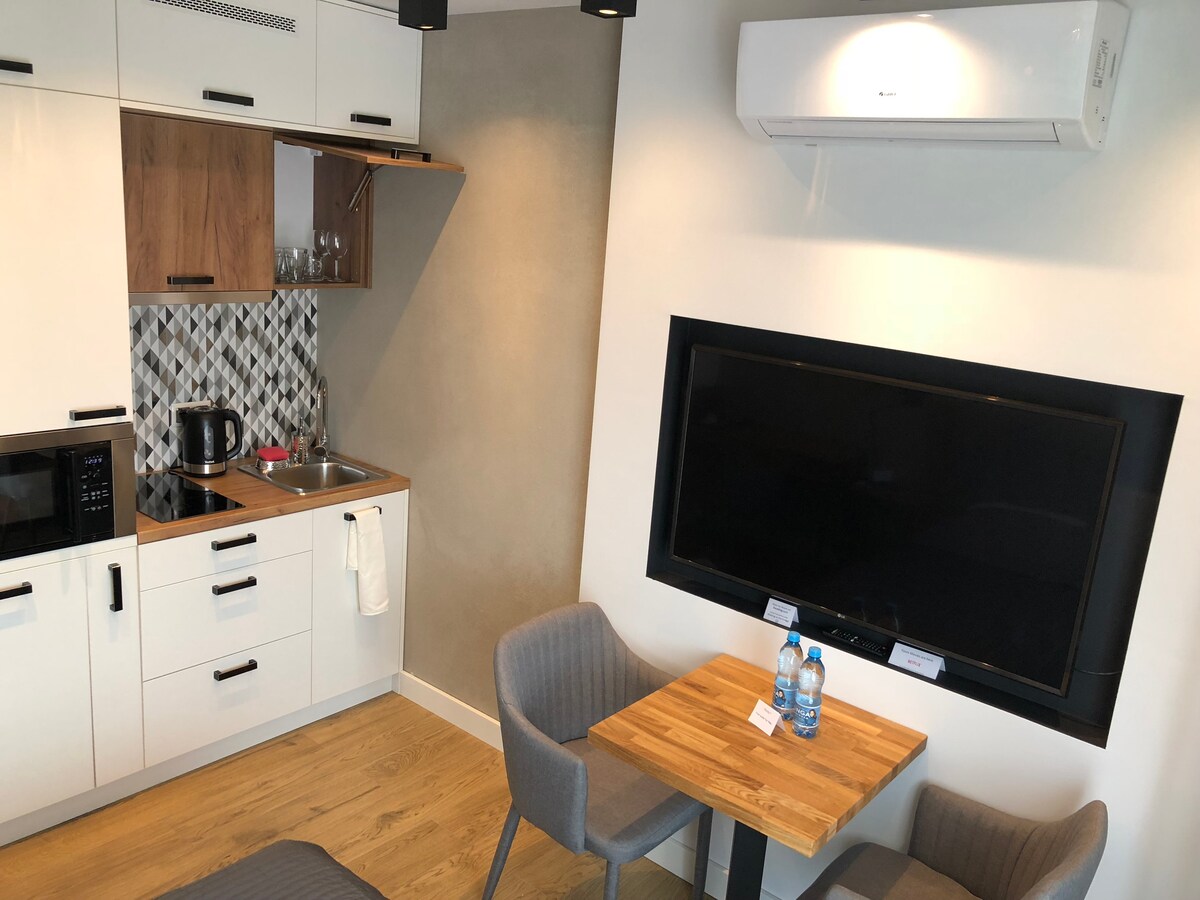 Przytulne i funkcjonalne studio z prywatną łazienką oraz aneksem kuchennym, położone na drugim piętrze budynku. Mieszkanie jest w pełni wyposażone i urządzone z myślą o komforcie jednej lub dwóch osób. Aneks kuchenny umożliwia swobodne przygotowywanie posiłków i jest zaopatrzony we wszystkie niezbędne naczynia. Dogodna lokalizacja, tylko 14 minut jazdy samochodem od lotniska Chopina. W okolicy budynku dostępne są bezpłatne miejsca parkingowe.