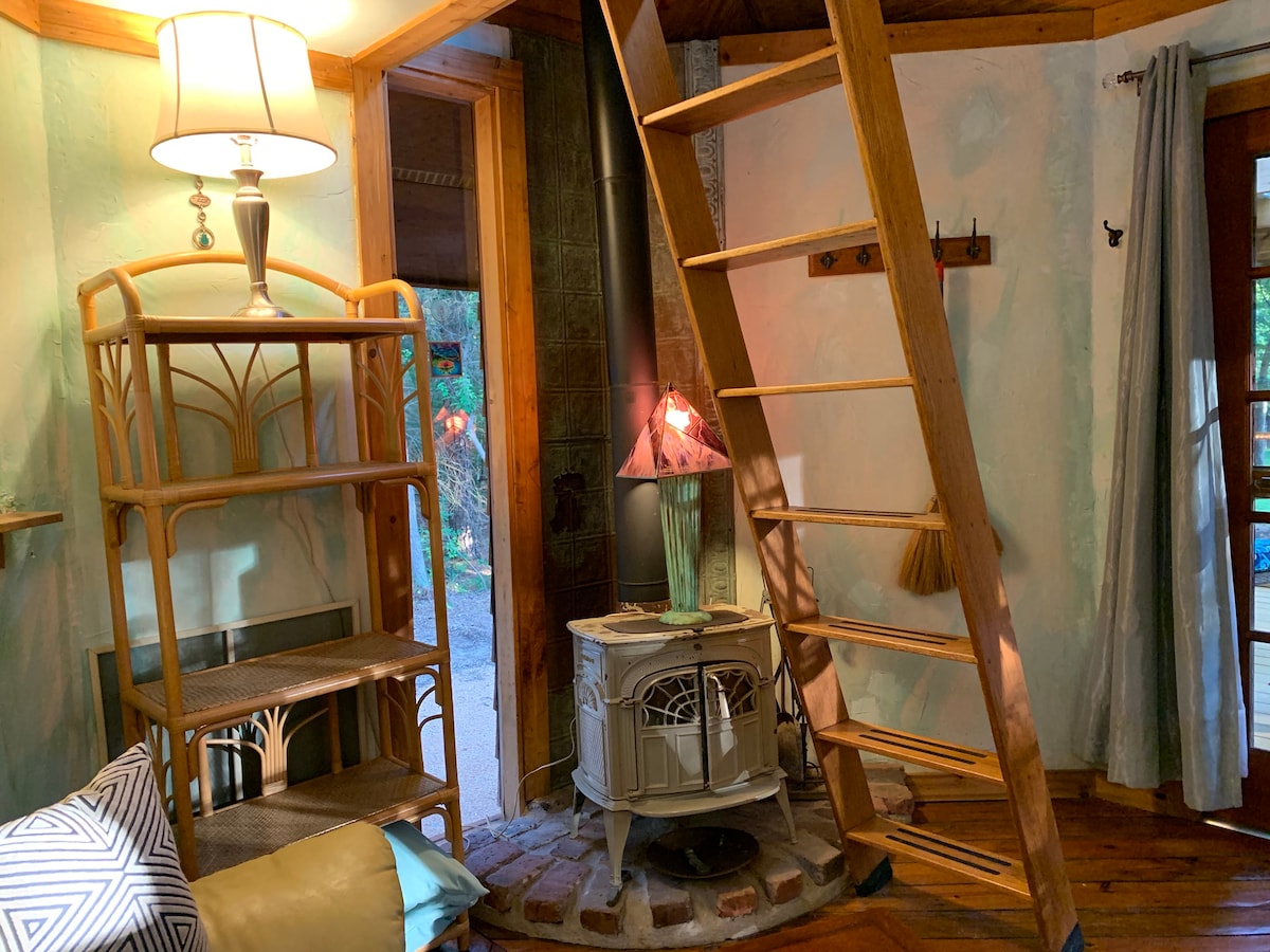 Private cottage with large screened in deck & comfy sleeping loft among the trees. A vertical ladder leads to a beautiful half-story sleeping loft. There is art throughout the space. Mini fridge & microwave on deck. Guests use a beautiful outdoor shower w/ hot & cold water until temps reach freezing. 11/9 UPDATE- Our new heated bathroom building which includes a flush toilet hot & cold sink and indoor shower is now complete & ready for your use! There are 2-friendly Aussi-dog on the property.