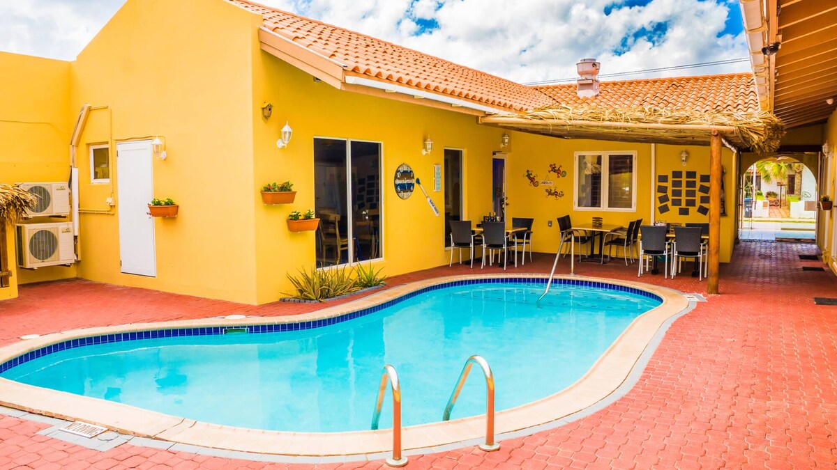 Somos una hermosa Villa donde nuestros huespedes podrán disfrutar de un ambiente fresco, confortable e íntimo. Esta confortabe habitación está ubicada en la zona más céntrica de Aruba y está rodeada de hermosos jardines en un ambiente inigualable. Somos la opción ideal para familias y grupos de amigos que buscan sentirse como en casa. Atreve a conocernos! Lee las evaluaciones de nuestros visitantes!