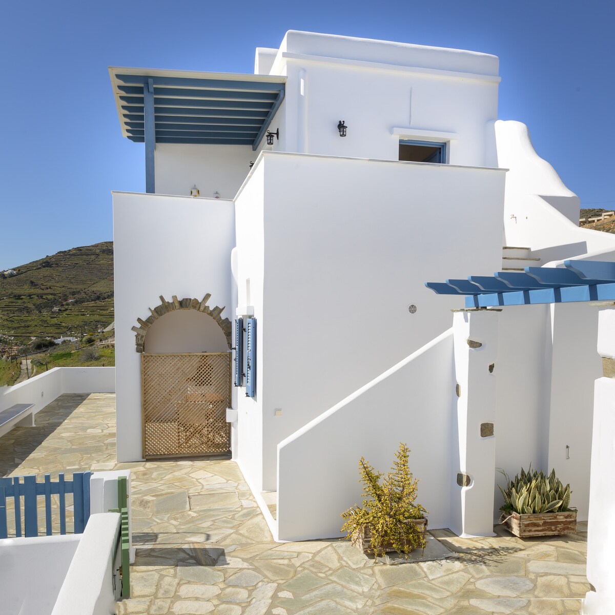 Los apartamentos con terraza con vistas se encuentran en la hermosa Tinos. Una isla de las Cícladas donde el huésped podrá encontrar una combinación de factores para unas vacaciones tranquilas. En la zona de Ag. Giannis, a 5 km del puerto y a 500 metros del mar , podremos hospedarte en un entorno tranquilo con vistas infinitas al mar. Ideal para familias con niños pequeños Quédate con toda la familia en esta maravillosa casa con mucho espacio para momentos de alegría.