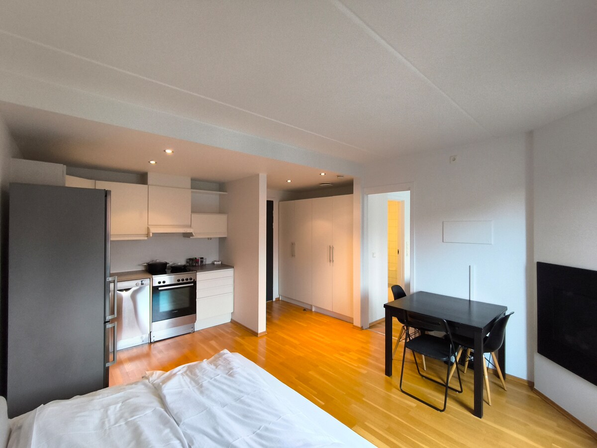 Un apartamento acogedor con una ubicación perfecta en una calle tranquila y de poco tráfico. A poca distancia a pie tienes una rica selección de restaurantes, tiendas de comestibles, parques, tiendas y transporte público. - Habitación privada con cama cómoda. - Baño e inodoro separados. - Cocina totalmente equipada. - Acogedor salón con sofá y comedor. - Wifi rápido y estable. El apartamento es perfecto para parejas, viajeros de negocios o viajeros solitarios que desean un alto confort y una ubicación excelente.