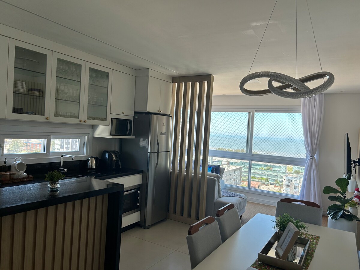 Excelente apartamento frente al mar y en la zona central de Tramandaí-RS. Tiene capacidad para 5 a 6 personas cómodamente. Con 2 dormitorios: 1º dormitorio: cama queen size. 2º dormitorio: litera y colchón extra de pareja. Sala: Sofá que se puede utilizar como cama. Cocina completa, baño con taque para ropa y vista lateral al mar. Recién reformado y decorado para ofrecer el máximo confort durante su estancia. ¡Ven a disfrutar del verano con nosotros! Familiar y acogedor, perfecto para familias, amigos y parejas.