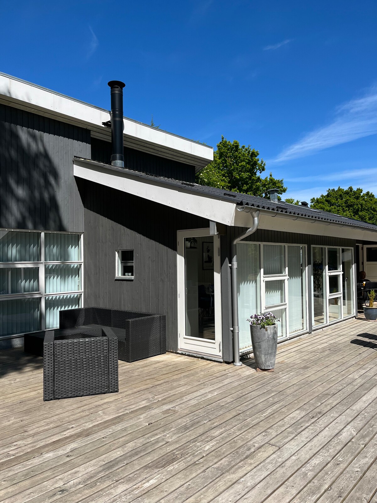 Una hermosa casa de campo familiar más nueva en el bosque - 109 m2 + 45 m2 anexo, jacuzzi al aire libre, bañera de hidromasaje y sauna. Hay terrazas alrededor de la casa, pista de voleibol de playa y zona de barbacoa. Hay una corta distancia al mar y 10 minutos a las hermosas playas de Øster Hurup y 5 minutos para ir de compras. La casa tiene capacidad para 8-10 personas. La casa está equipada con banda ancha de fibra y wifi que cubre toda la parcela natural de 3000 m2. En julio y agosto, el check-in es el sábado. Puede haber algunos insectos en ciertos períodos.