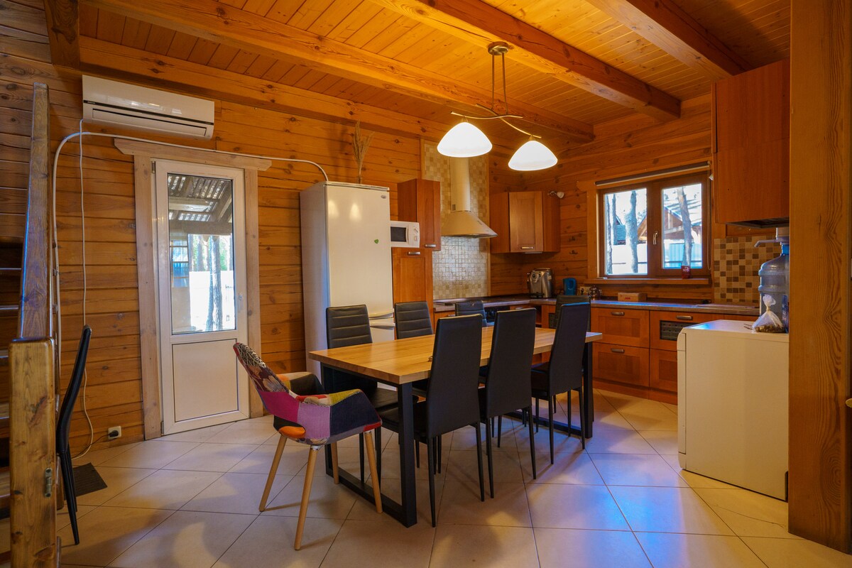 Уютный и теплый деревянный дом находится в сосновом лесу на территории коттеджного городка. Здесь можно провести выходные, каникулы или просто жить вдалеке от города посреди соснового леса. В доме есть оборудованная кухня, бытовая техника и камин. Дом окружен соснами, а река всего 10 мин пешком. Расстояние до Киева 40 мин на авто.