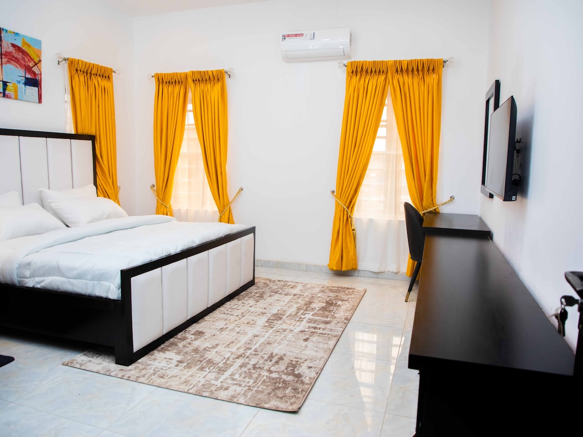 Un apartamento de un dormitorio, baño y sala de estar con una mezcla de diseños de madera afrocentristas y modernos contemporáneos. Spa en la casa (una sauna, vapor y salas de masajes), restaurante en la casa, gimnasio y sala de café, piscina al aire libre con pérgola junto a la piscina, electricidad 24/7, seguridad y circuito cerrado de televisión. Es ideal para estancias largas y cortas con un mínimo de tres días, situado a cinco minutos en coche del aeropuerto internacional y a doce minutos en coche del aeropuerto nacional. Recogida y traslado al aeropuerto disponibles.