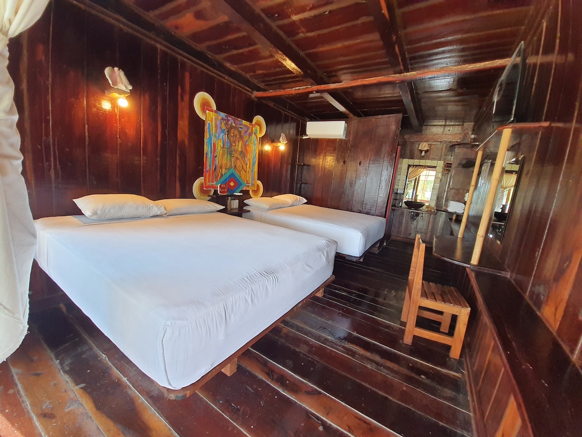 Hermoso bungalo de madera a un lado una de las lagunas mágicas del caribe. Cuenta con una cómoda cama king-size, un amplio baño privado, además de contar con ventilador en techo alto ofrece noches frescas para descansar.