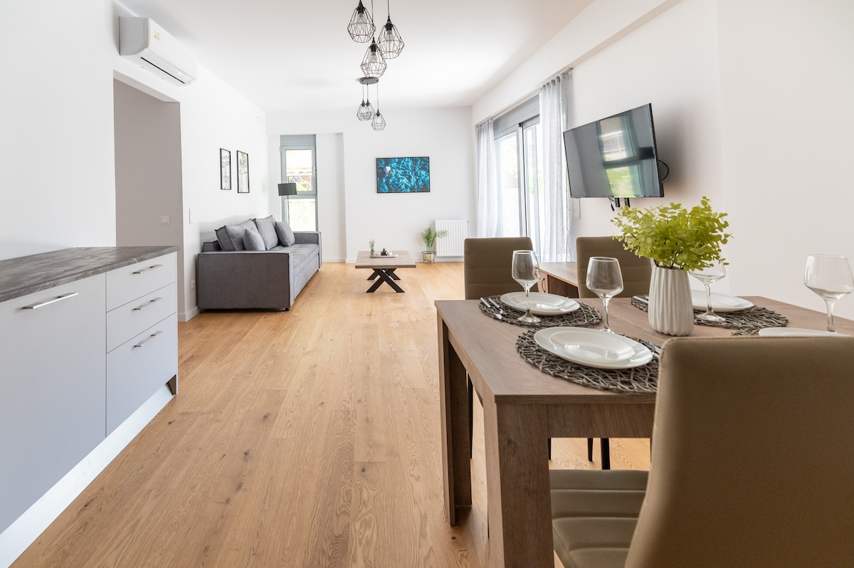 This cozy 75sqm apartment is a place to feel at home and create beautiful memories. It features two inviting bedrooms with double beds and orthopedic mattresses, a fully equipped kitchen, and a bright living room with a large sofa, Smart TVs, home cinema, and fast 500 Mbps WiFi. Silent air-conditioning keeps you comfortable through the Greek summer, while a washer and dryer make long stays easy. The wraparound balcony is perfect for coffee, laughter with friends, or a peaceful evening breeze.