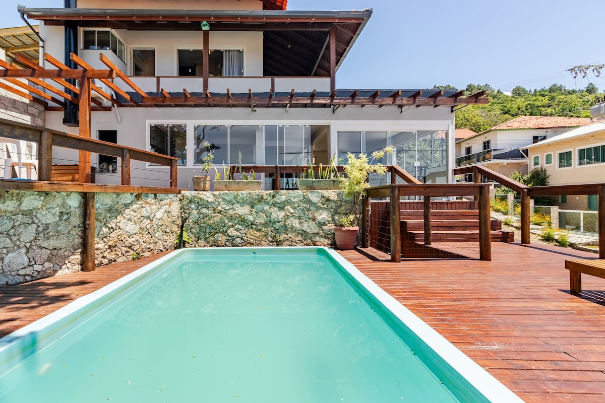 ¡CASA PÉ EN LA ARENA CON PISCINA! La casa de 2 pisos sola en el terreno tiene 3 dormitorios, una gran sala de estar con aire acondicionado, dos baños, una cocina totalmente equipada y un gran balcón con hamacas. Proporcionamos toallas, almohadas, ropa de cama, entre otros. Tenemos kayaks y boyas a disposición de nuestros huéspedes. La playa al aire libre tiene un mar tranquilo, adecuado para nadar, ideal para niños y para practicar deportes acuáticos. @recantopenaareiasc