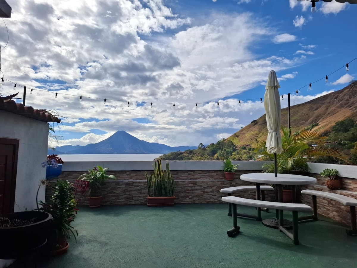 Disfruta de impresionantes vistas panorámicas del lago de Atitlán, sus volcanes circundantes y las montañas desde tu santuario de diseño artesanal. Despiértate con amaneceres épicos y observa aves mientras descansas en el sofá o en un colchón ortopédico tamaño queen. La casa cuenta con una cocina diseñada por un chef, decoración artesanal, wifi, 1,5 baños, una ducha de agua caliente y fácil acceso a senderismo y yoga. A 7 minutos a pie o a un corto paseo en tuk-tuk desde el centro de San Marcos. Ideal para parejas, creativos, nómadas digitales y amantes de la naturaleza.