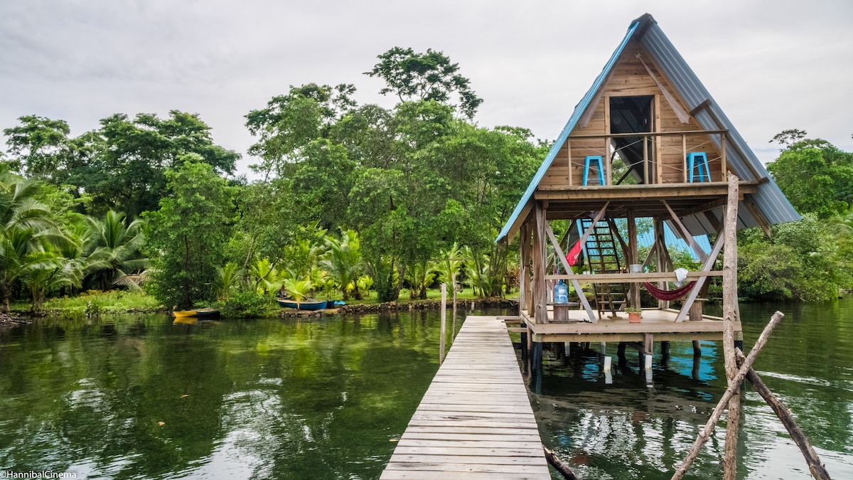 Despiértate con impresionantes vistas a la selva y al mar en este bungalow ecológico de lujo en la cima de una colina en Isla Bastimentos. Construida con madera local, cuenta con una sala de estar al aire libre con flujo de aire natural, ventanas con mosquitero, un dormitorio con aire acondicionado, wifi y una cocina completa. Disfruta de la serenidad, la sostenibilidad y el paisaje caribeño, al que se llega por 89 escalones panorámicos, perfectos para parejas de luna de miel, viajeros ecológicos y nómadas digitales que buscan un refugio privado en la isla.