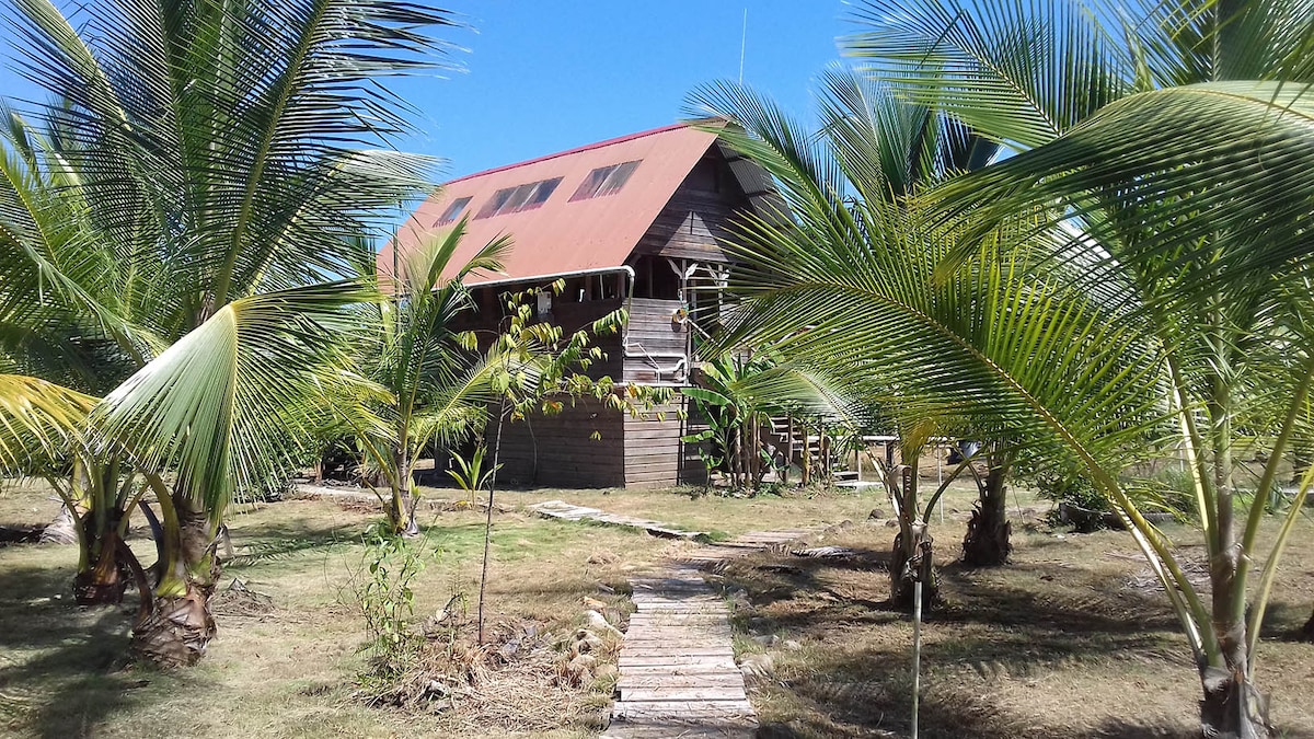 Welcome to a one of a kind surrealist adventure resort! Our house boasts being the most artistic and best built in all of Bocas. Eco-friendly, of course. Enjoy your very own white sand beach, shade from the palms and spectacular coral reef just outside your door. The house is three stories with incredible views of the Zapatillas islands from your front balconies and natural jungle views from the back ones. The house stays cool and breezy with it's open layout and beach front location.