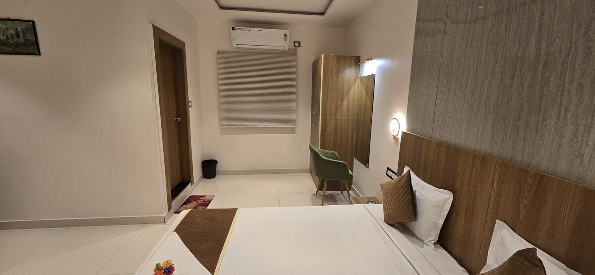 Una casa de familia para ti y tu familia. Tenemos un total de seis habitaciones, dos con aire acondicionado y cuatro con ventilador. Cada habitación tiene su propio baño privado con ducha caliente y pastilla de champú/jabón. La casa está cerca del grupo occidental de templos, a 10 minutos a pie del centro del pueblo y a 20 minutos de la estación de tren (en coche). En mi casa tendrás desayuno de cortesía y también puedes probar comida india para almorzar o cenar.