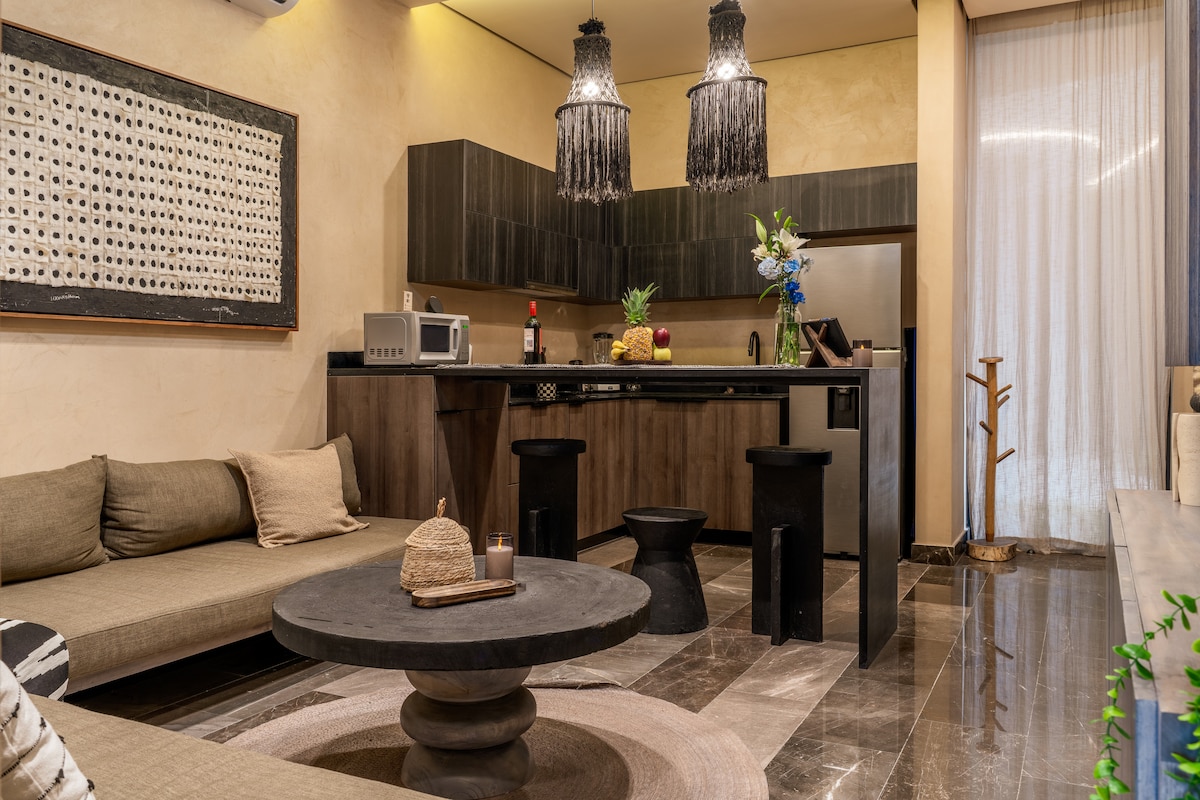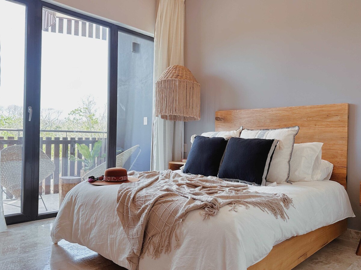 🌿Loft artesanal estilo cueva con cama king, iluminación cálida, texturas naturales y detalles hechos a mano, ideal para una escapada romántica o creativa. Terraza privada, cocina equipada y acceso a 4 albercas rooftop con vistas al mar y selva, puentes de cristal, gimnasio y area de trabajo. Un refugio íntimo, único y lleno de estilo en Tulum. 🏖️ Acceso incluido a 3 Beach Clubs: uno solo para adultos uno familiar y otro Pet friendly. Incluye camastros y toallas, sin costo.