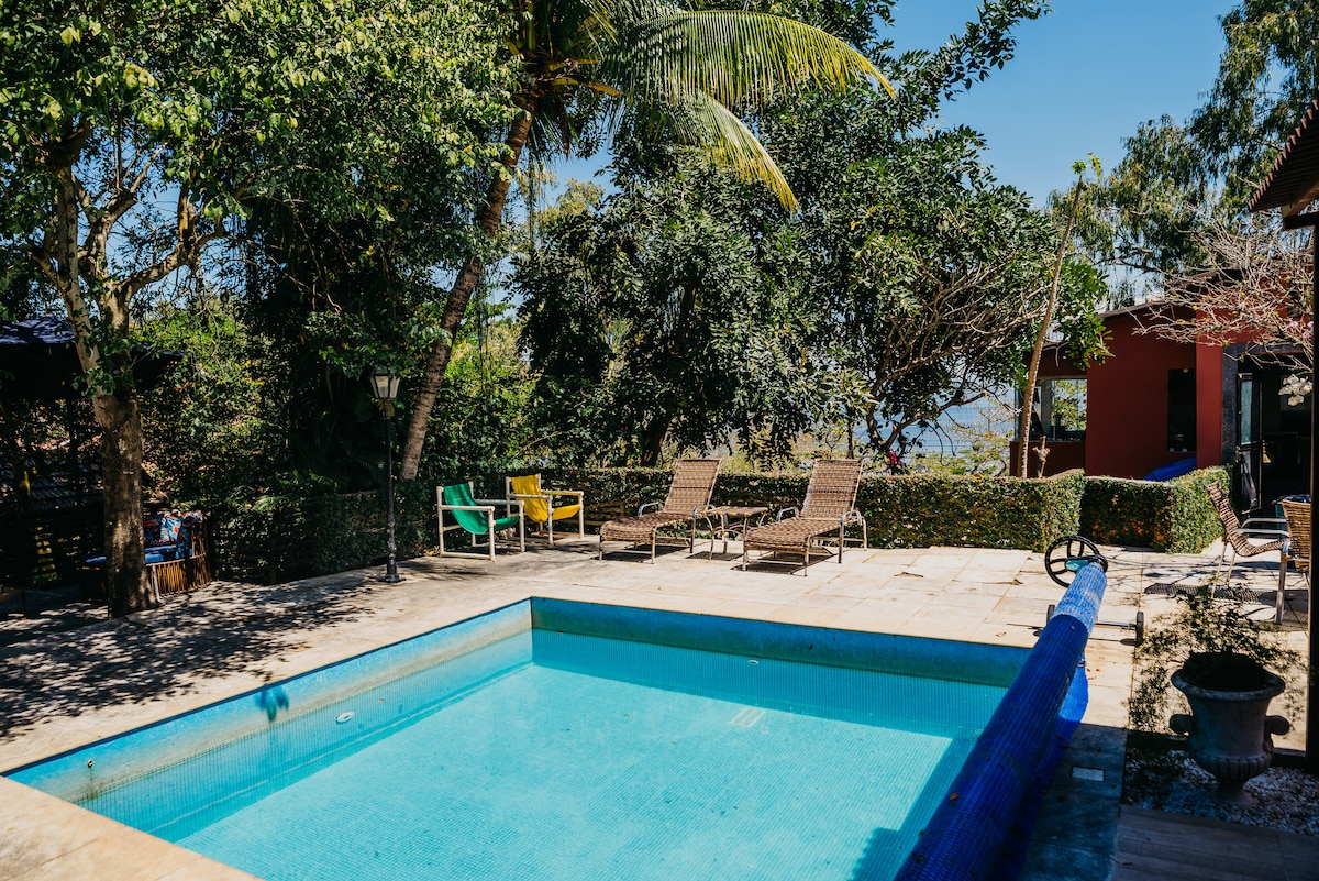 Magnífica casa, na ilha de Paquetá, à apenas 1 hora de barca do centro do Rio de Janeiro. Casa com 3 suítes, um quarto e uma suíte externa, todas com ar condicionado e ampla piscina com churrasqueira. Na área da piscina temos churrasqueira, geladeira, freezer, isopor, fogão, louça, talheres e copos para até 35 pessoas e uma caixa de som com a qual você pode parear seu celular e ouvir suas música favoritas. Ótima casa para passar fins-de-semana com a família e amigos.