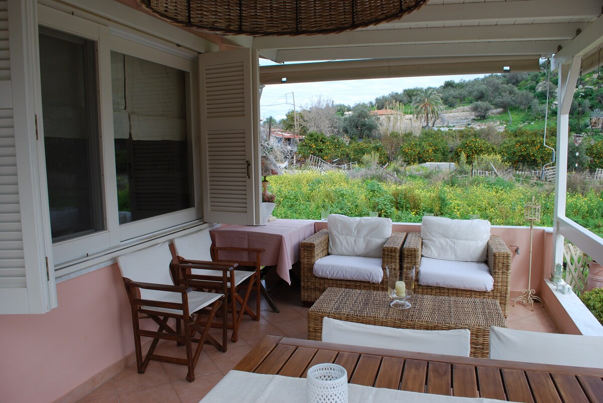 Lovely little cottage 200m from the sea with private garden beside the orange trees! If you want to enjoy a pleasant breakfast with singing birds and then start your adventure in Argolida then our cottage is for you! The house is 10 minutes walking distance away from Ancient Epidavros center in a quiet area near the small theater. This cottage is ran by Marina and Leonidas who will try to guarantee you a pleasant stay! Note: Take advantage of our discount for weekly or monthly stays!