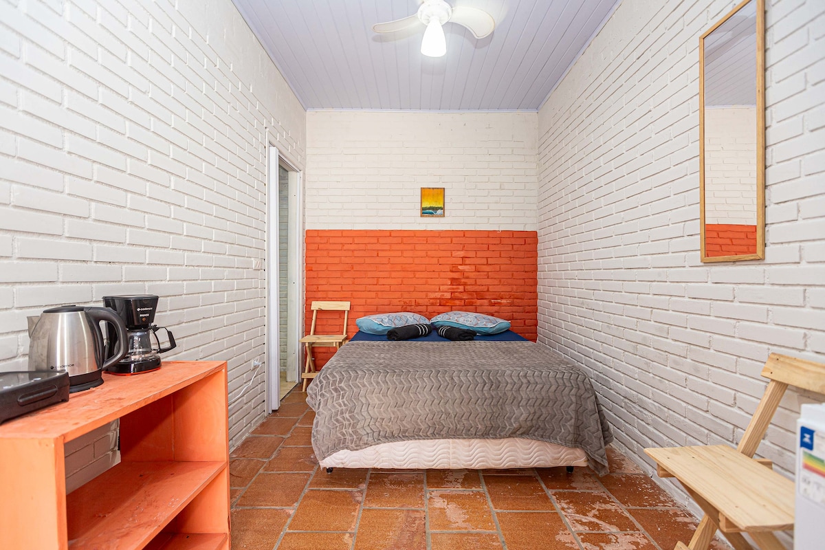 Suite exclusiva a apenas duas quadras da praia! 🌅🏖️ Cama box casal, roupas de cama e banho, armários para roupas, ventilador de teto, frigobar, cafeteira, sanduicheira, chaleira elétrica e chuveiro elétrico 220v. Check-in e check-out flexíveis! Consulte disponibilidade! Check-out mais tarde no domingo de cortesia!