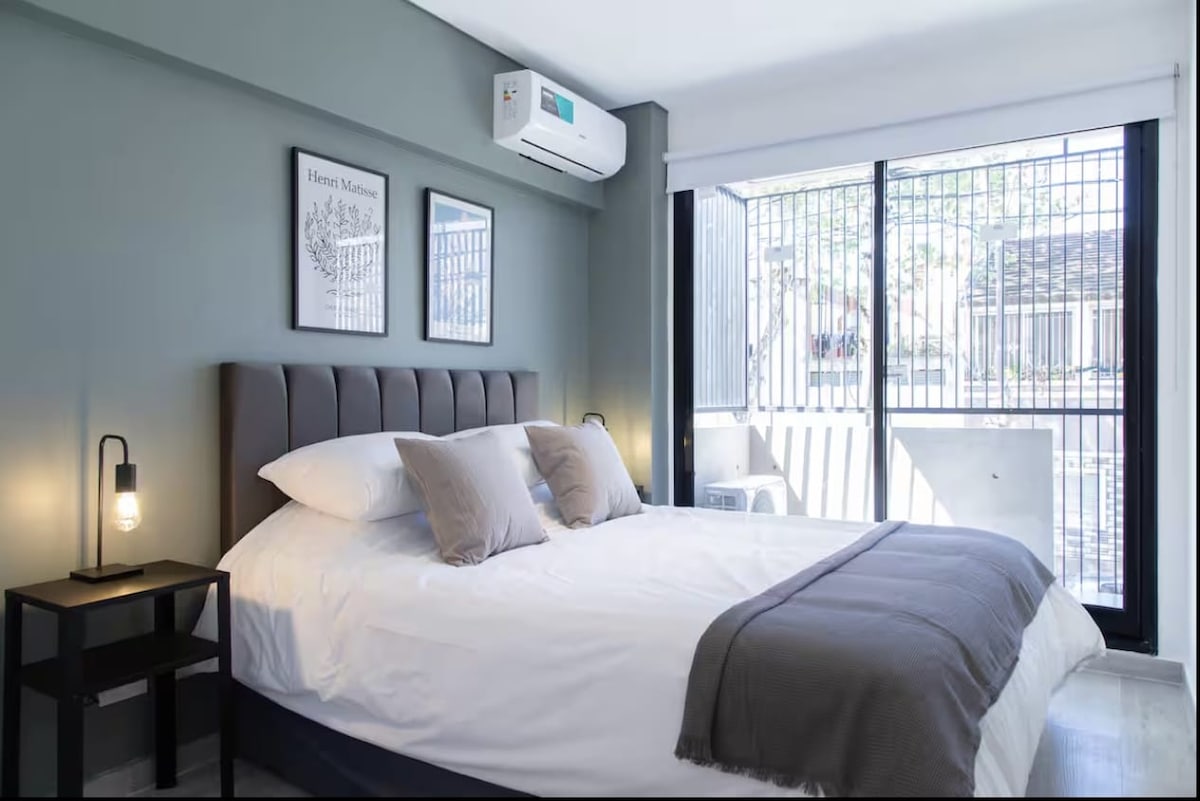 Moderno y luminoso para aquellos que buscan conectar rápido con la ciudad y disfrutar de un departamento premium. Inspirado en un cuarto de hotelería es tranquilo, silencioso, seguro y super confortable. Cerradura electrónica (sin llaves, sólo con código personal) Locales de primeras marcas a los alrededores, a 120 metros del subte y 3 estaciones del Movistar Arena. A 20 minutos del Aeropuerto. Te resolvemos el cambio de dinero, y tarjeta de transporte en el check in .