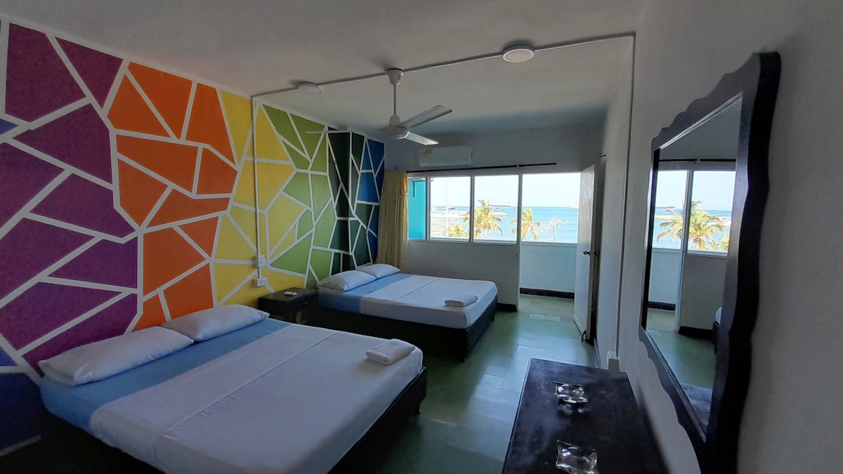 ¡Un espacio especial con alma caribeña! Nuestra habitación doble con aire acondicionado ofrece el equilibrio perfecto entre confort y un diseño artesanal único. Rodeado de colores vibrantes y detalles auténticos, relájate en la terraza principal mientras disfrutas de atardeceres espectaculares. Cada espacio de nuestro hotel es diferente, pensado para desconectarte y llenarte de inspiración. A menos de 5 minutos caminando de la playa de Taganga ¡Te esperamos!