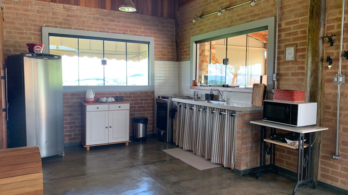 Venga a alojarse en una cabaña de madera a más de 1200 m de altitud, ubicada en la encantadora ciudad de Poços de Caldas, en medio de las montañas del sur de Minas Gerais. El chalet cuenta con bañera de hidromasaje, aire acondicionado (frío y calor), cama queen en un acuario de vidrio, terraza con vista a las montañas y una puesta de sol inolvidable, además de un área exterior con césped de mil metros, chimenea de jardín, una pérgola para picnic romántico y fotos inolvidables, ¡con su amor y su mascota!