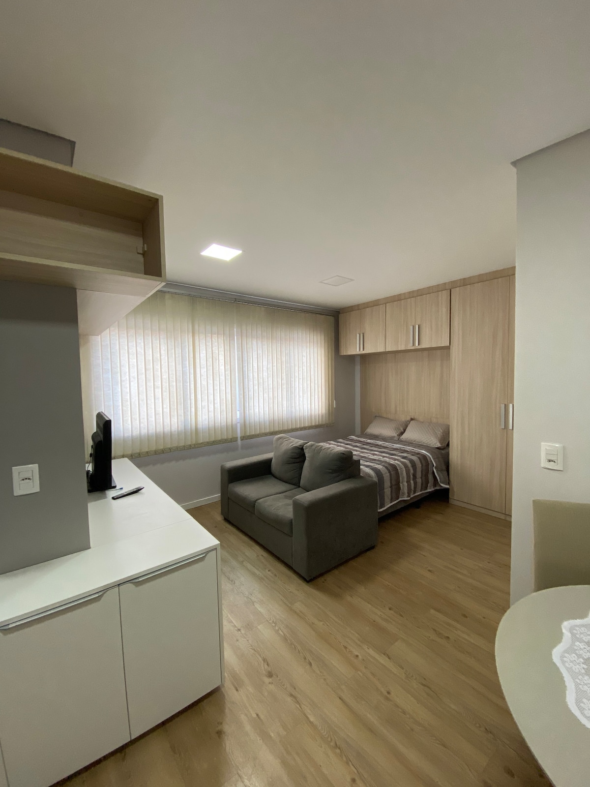 Apartamento completo disponible en el centro de Passo Fundo. Sala de estar, cocina con área de servicio y dormitorio. Amplio baño y balcón con parrilla. También está disponible el espacio de trabajo (mesa y silla). Cerca del Colegio Bom Conselho y de la estación de autobuses.