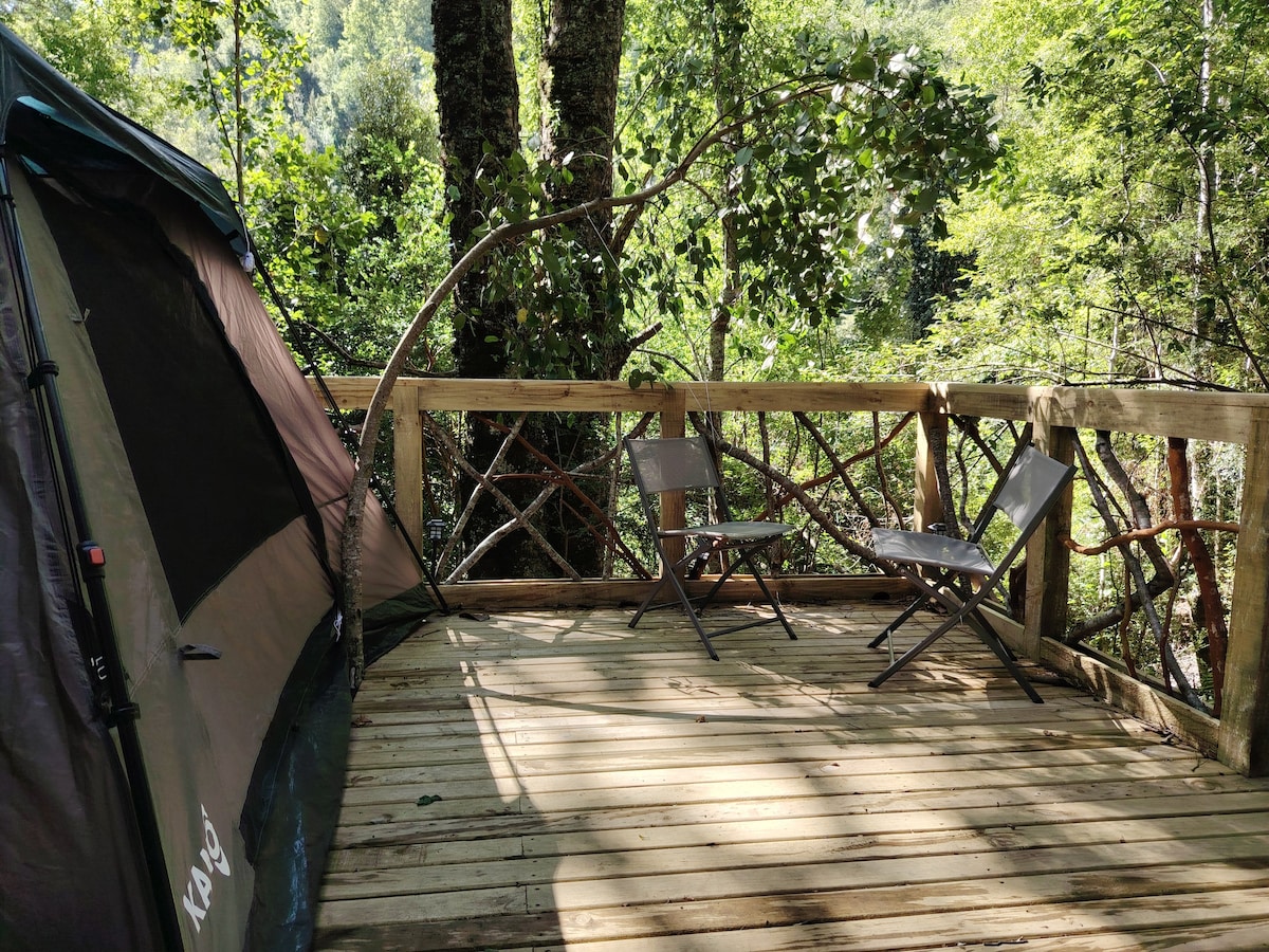 Desayuno de campo incluido. Inmersas en el bosque y abrazadas por dos ríos, nuestras carpas están equipadas con todo lo necesario para tu comodidad. A sólo 25 minutos de Pucón y en ruta a diferentes centros termales y parques nacionales como Huerquehue y El Cañi, disfrutarás de vistas espectaculares, el canto de las aves y el arrullo del río Liucura. Ofrecemos una cama muy confortable, calefacción y baño privado, además de un cobertizo y un espacio para hacer fuego y compartir.