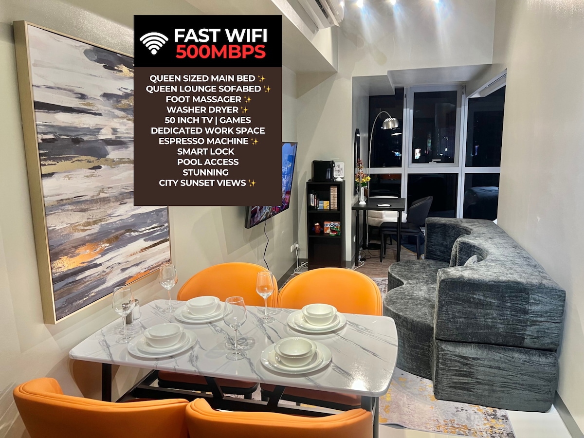 Olvídate de las preocupaciones en este gran alojamiento: ¡es un oasis de tranquilidad! El apartamento tiene vistas al atardecer desde Mckinley y BGC. La calidez que se siente desde el exterior del balcón es como si estuvieras en la playa de Boracay. Por la noche, te sentirás tranquilo contemplando las vistas de la ciudad. Está equipado con electrodomésticos modernos e internet de 25 mpbs y ofrece comodidad con un centro comercial cercano, gimnasio, restaurante y cafetería.
