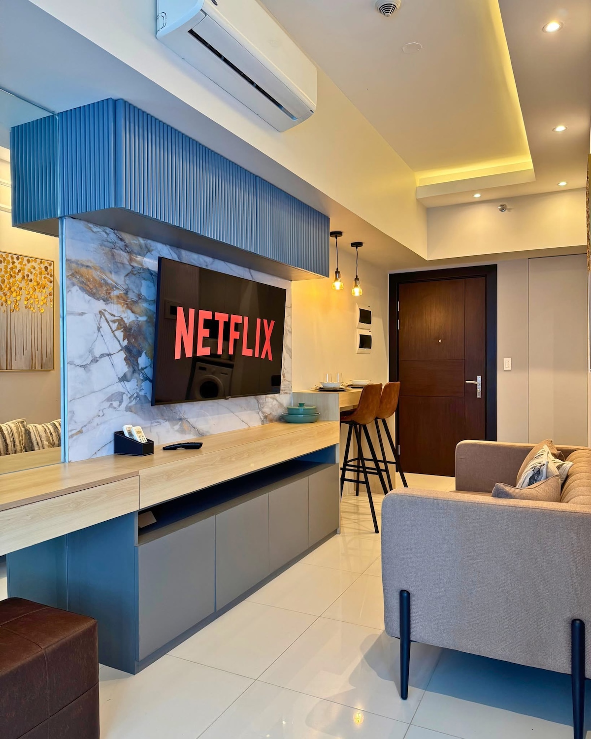 Reserva esta lujosa estancia en el centro de BGC. Todo está a solo unos pasos. Oficinas de primera calidad y centros comerciales de alta gama rodean Uptown Parksuites. Disfruta de una escapada cosmopolita en el centro comercial Uptown. Descubre conceptos únicos de comida y compras. Diviértete toda la noche en bares de primer nivel a la vuelta de la esquina. Relájate en nuestra unidad de dormitorio de mediados de siglo. Relájate en una cama tamaño queen y un sofá cama adicional. Las comodidades incluyen un televisor inteligente de 50 pulgadas, internet de 400 MBPS, área de estudio y balcón privado.