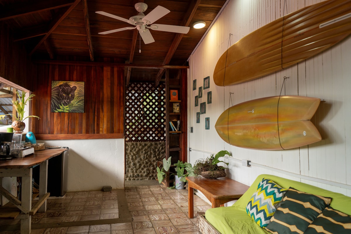 A very unique oceanfront home steps from the sand and surf. Super kicked back one dirt road town. Friendly English and Spanish speaking community with a good vibe. A lot of wildlife in the area. Weekly coop that drives through. Great place for surf, nature and relaxing. Large yoga space upstairs with extra sleeping area and screened porch facing the ocean. Down the beach from Pavones, the world's longest left. Across from the wild Osa Peninsula. One of the most biodiverse places on earth🌎