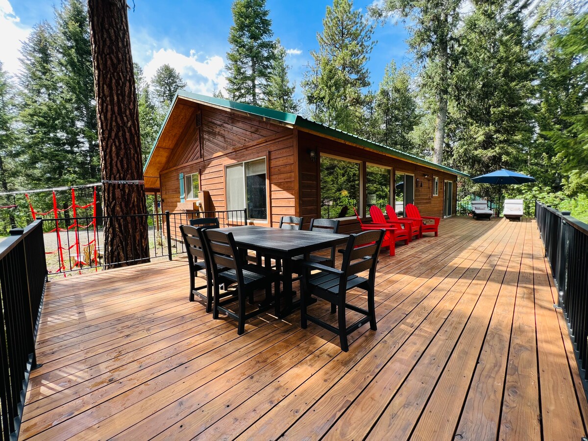 Disfruta de esta hermosa casa de 4 dormitorios, 3 baños, sala de juegos y oficina enclavada en las montañas de Donnelly. Relájate en el interior o disfruta de actividades al aire libre durante todo el año. Situado en un callejón sin salida tranquilo. Impresionantes vistas a la montaña, a 10 minutos del centro vacacional Tamarack. A 5 minutos del lago, la playa, los parques estatales a pie, en bicicleta. Chimenea exterior Muebles y juegos de patio Jacuzzi para 6 personas Sala de juegos de arriba... piscina, vídeos, TV, futbolín Garaje grande - Aparcamiento en la entrada Dormitorio loft, baño Aparcamiento en garaje y entrada