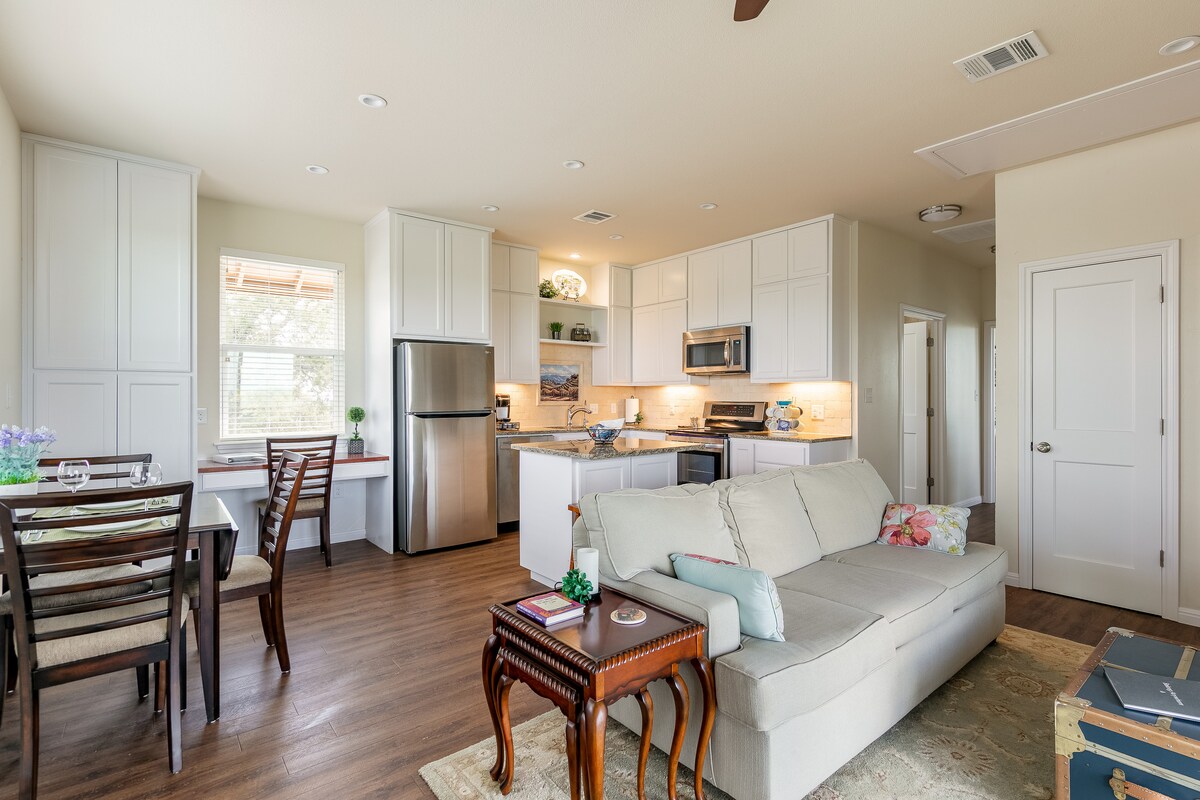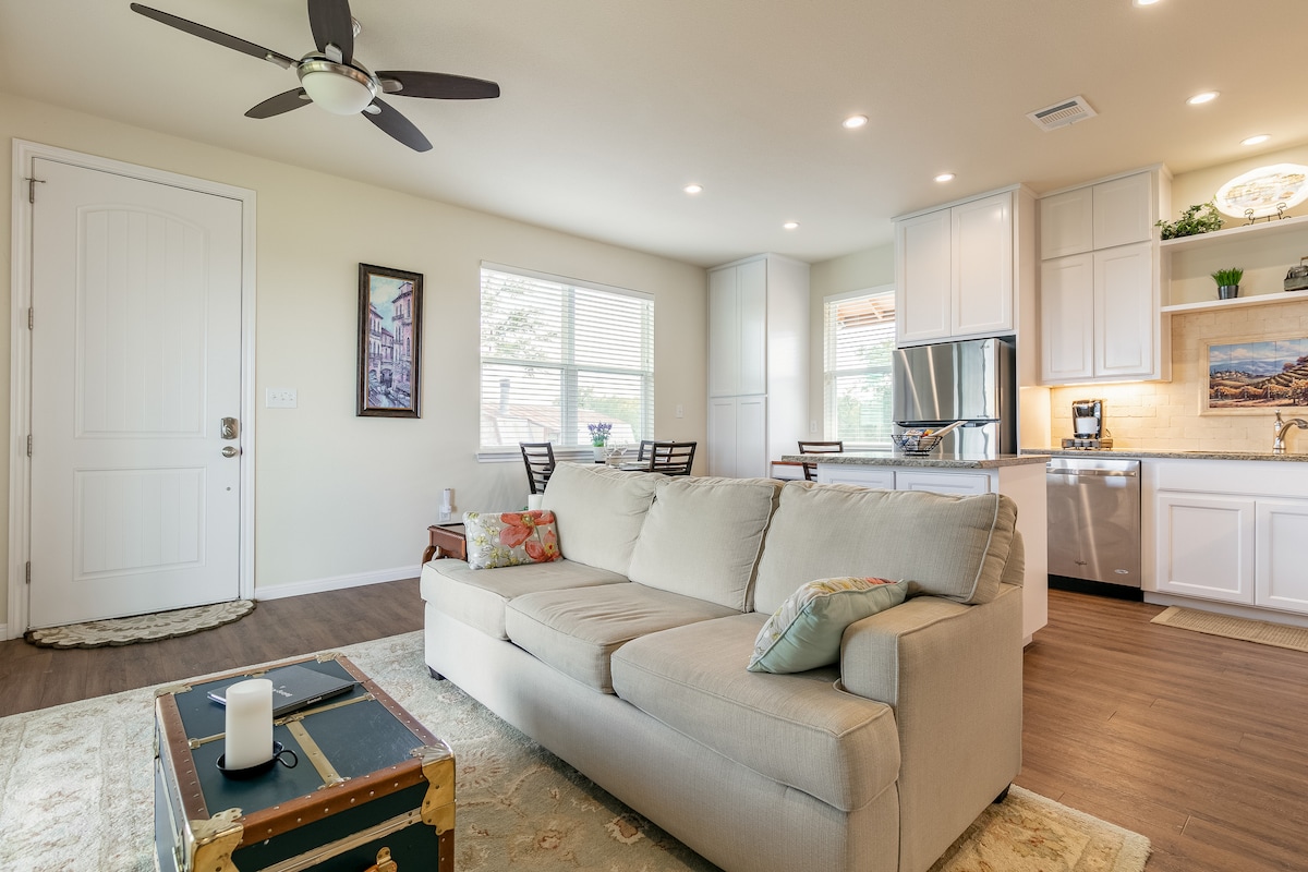 Relájate en esta suite privada independiente de 1 dormitorio y 1 baño con su propia entrada y estacionamiento fuera de la calle. Camina hasta la Universidad Estatal de Texas o disfruta de los restaurantes, bares y locales de música del centro de San Marcos. Perfecto para una estancia relajante para vacaciones, negocios o visitas con tu estudiante (¡sabes que te extraña!). Las comodidades incluyen una cama súper cómoda, cargador de vehículos eléctricos (tanto para Tesla como para otros vehículos eléctricos), cafetera, nevera, microondas, espacio de trabajo de escritorio, lavadora/secadora gratuita y wifi.