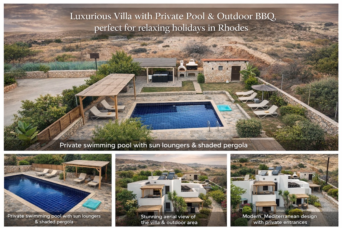 Ossiano Pool Villas en una ubicación ideal donde puedes explorar fácilmente la isla, ya que está situada en el centro de Rodas Ubicado en una tranquila carretera de playa, pero cerca del pueblo y de 3 maravillosas bahías diferentes *** EL COSTO DE LA PISCINA DE CALEFACCIÓN PARA LOS MESES MÁS FRÍOS DEL AÑO SERÁ DE 35 EUROS POR DÍA*** SI NO LO DESEAS, INFÓRMANOS 1 SEMANA ANTES DE LA LLEGADA Se requiere un depósito de 150 euros, que se devolverá en su totalidad a la salida.