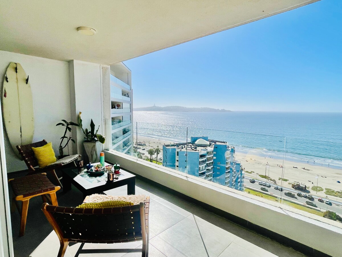 Departamento de lujo en edificio Jardín del Mar. En primera línea, frente al mar, a un costado de Casino Enjoy. Departamento en piso 4, amplia terraza con vista al mar y piscina principal. Completamente equipado. Grandes piscinas al aire libre, piscinas temperadas. Incluye sabanas y toallas. Jacuzzi, Gimnasio, Sauna, Piscina Temperada, llevar gorra de baño. Estacionamiento privado. Incluye SmartTv, Tv Cable (Incluye Futbol Nacional) en Dormitorio Principal y Living e Internet para Teletrabajo.