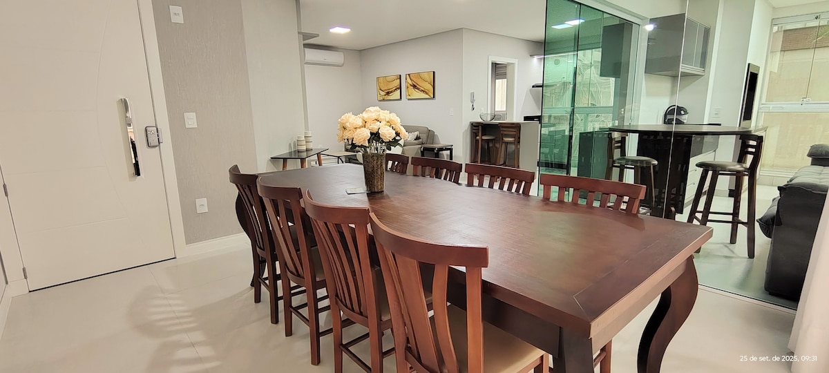 Amplio apartamento de 155m2 a pocos pasos del mar, 3 dormitorios, 1 suite, 1 plaza de aparcamiento perteneciente al apartamento con opción de alquilar otra plaza extra en el condominio, ascensor, balcón con barbacoa y cerveza con una hermosa vista al mar, TV 60 Smart en la sala de estar y TV led en 3 dormitorios, todas las habitaciones con aire acondicionado, incluida la sala de estar, cocina completa, 2 refrigeradores y 1 cerveza, ofrecemos sombrillas y sillas de playa. Excelente ubicación cerca de restaurantes y supermercados