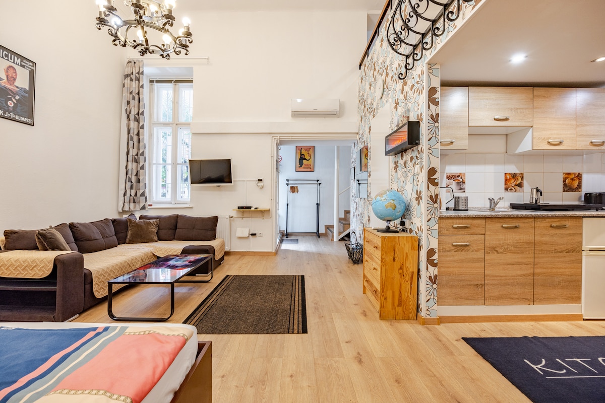 ¿Alguna vez has soñado con el extravagante estudio de un artista? Siente el ambiente y prueba el renovado loft estudio de un famoso pintor húngaro Lajos Vajda, frente al parque más grande de la ciudad, Városliget. Estaciona de forma gratuita en nuestro garaje subterráneo y cocina en nuestra cocina con sorprendentes gabinetes de madera y ladrillo visto. Una lámpara de araña elegante de fábrica cuelga sobre una mesa de comedor moderna mientras que una sala de estar disfruta de la luz natural de las ventanas industriales. Hermosamente diseñado en una casa de 100 años de antigüedad, cerca de la plaza Heroes.