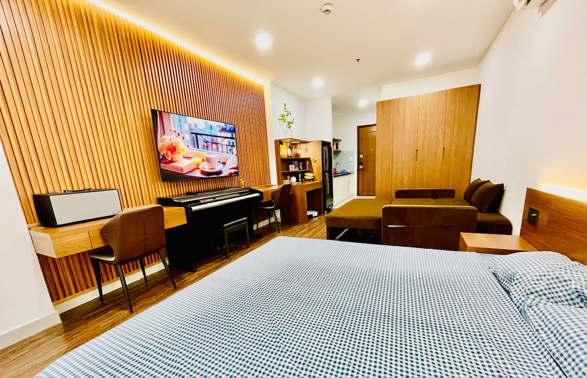 El apartamento es adecuado para huéspedes y familias que combinan viajes de negocios y vacaciones. Ofrece a los visitantes la sensación de alojarse en un hotel elegante pero disfrutando de un ambiente familiar. - Cama tamaño king de 1,8 x 2 metros de ancho y 1 sofá cama de 1,8 x 2 metros de ancho para una familia de 4 personas. - 2 mesas de trabajo, 1 piano, TV de 58 pulgadas con más de 100 canales gratuitos: Netflix, HBO, Max, deportes. - Zona de cocina, mesa de té + mesa de comedor, minibar, nevera, lavadora. - Piscina gratuita. - A 5 minutos del aeropuerto.