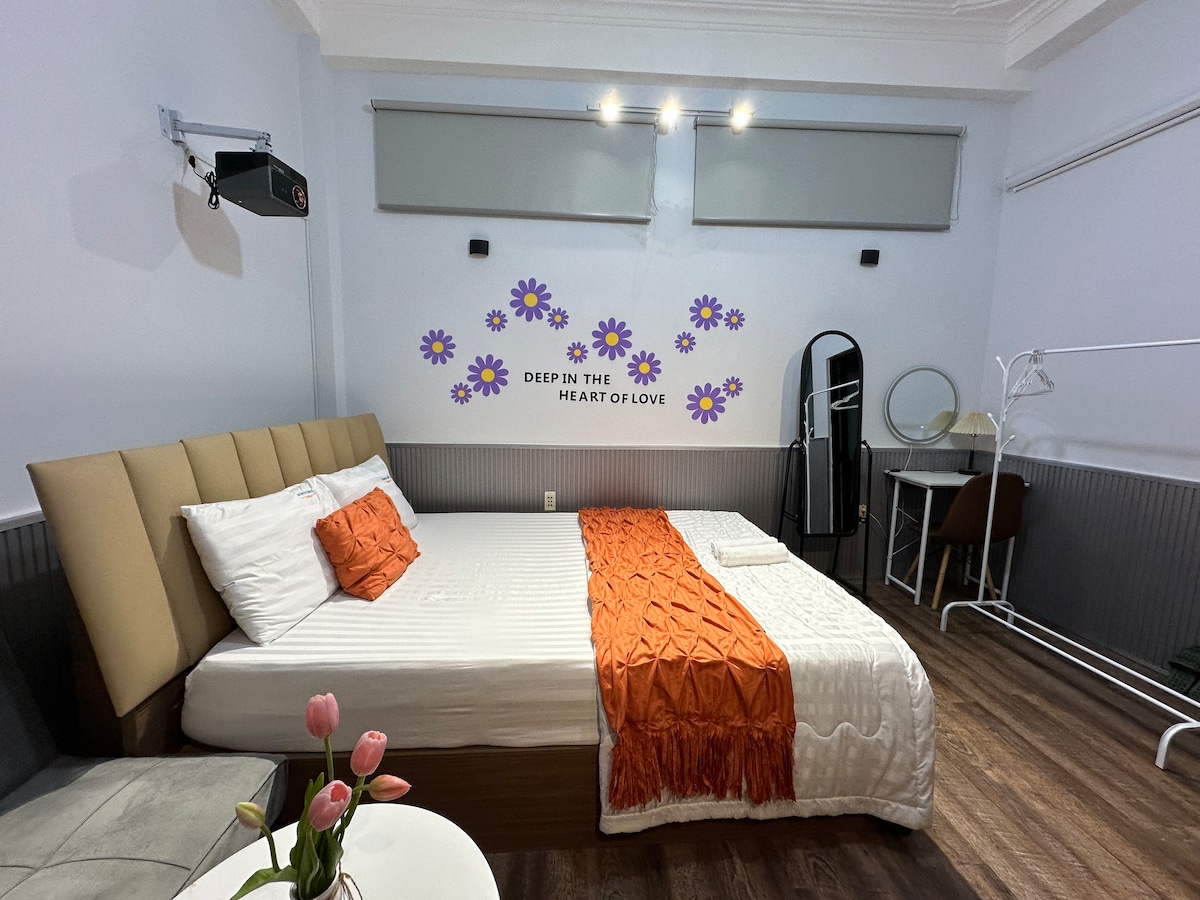Estudio totalmente equipado de 27 m2 con balcón. 1 cama tamaño king con cómodo colchón Dunlopillo. Cocina privada, baño, nevera, TV. Jardín al aire libre Anfitrión que habla inglés y vietnamita, internet de 70 Mbps. Buena ubicación: A 10 metros de la carretera principal. A 15 minutos en taxi del aeropuerto, estación de tren, Notre Dame. A 20 minutos del mercado de Ben Thanh, en el centro de la ciudad. A 5 minutos de centros de convenciones como White Palace, Adora, Quan Khu 7. A poca distancia a pie de mercados, tiendas, restaurantes...