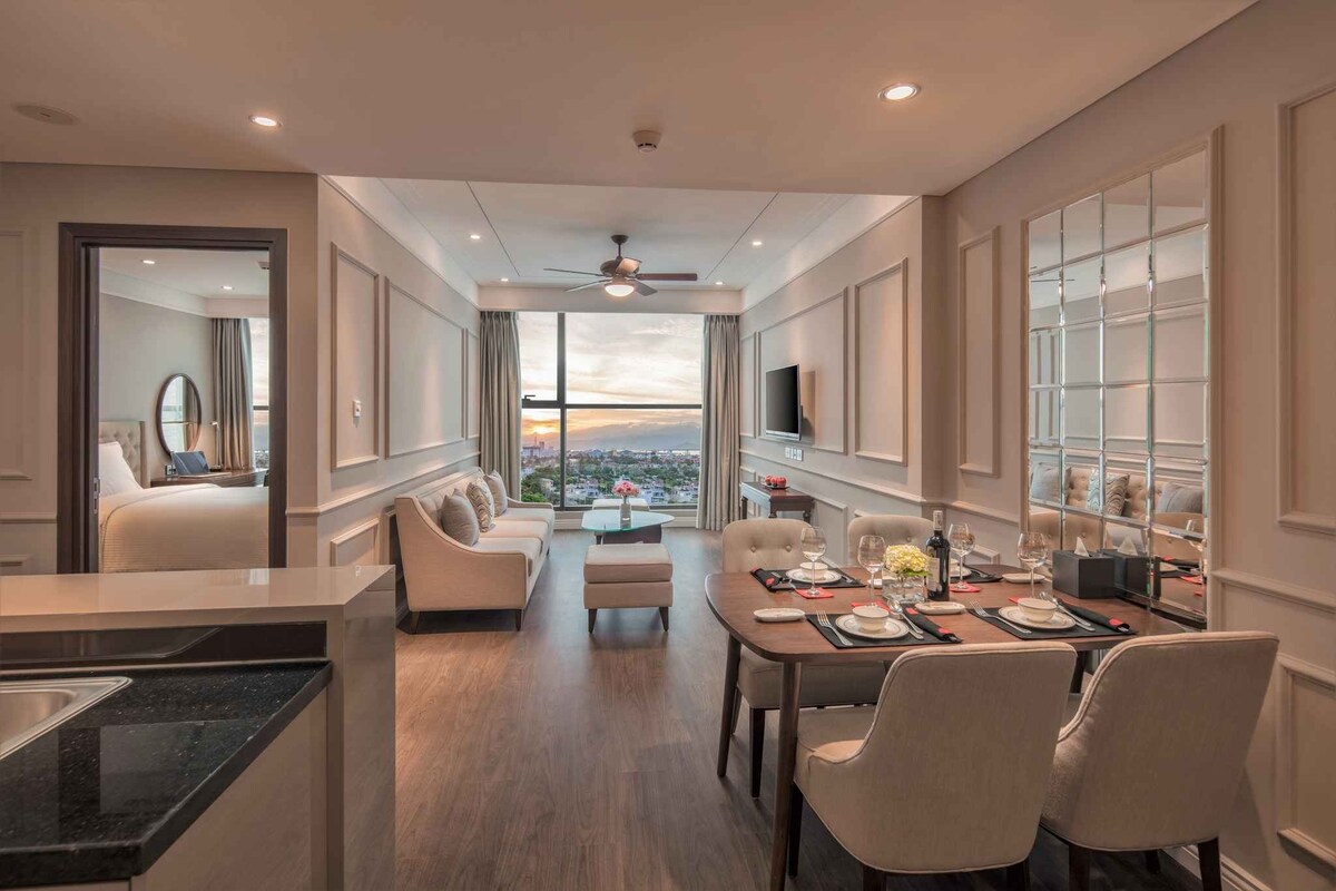 Altara Suites Apartment Zen Suites de 2 dormitorios con vistas al mar Zen Suites es la clase de habitación más grande del edificio Altara Suites con 2 balcones de la sala de estar y balcones con vistas al mar. Disfruta de la brisa del mar y mira el hermoso amanecer justo en tu apartamento. Desde el apartamento, está a pocos pasos de la hermosa playa de My Khe. Apartamento en planta alta, apartamento en esquina grande con área : 100 m2