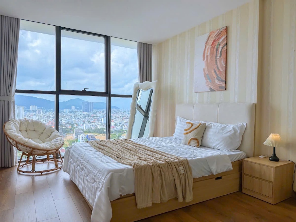 Căn hộ nằm ở tầng 24 được trang bị giường nằm êm ái, tầng cao view đẹp với tầm nhìn thành phố và hướng biển, tủ lạnh to thích hợp cho khách lưu trú dài ngày, được dọn vệ sinh sạch sẽ định kì. Các dụng cụ đầy đủ cho quý khách nấu ăn.