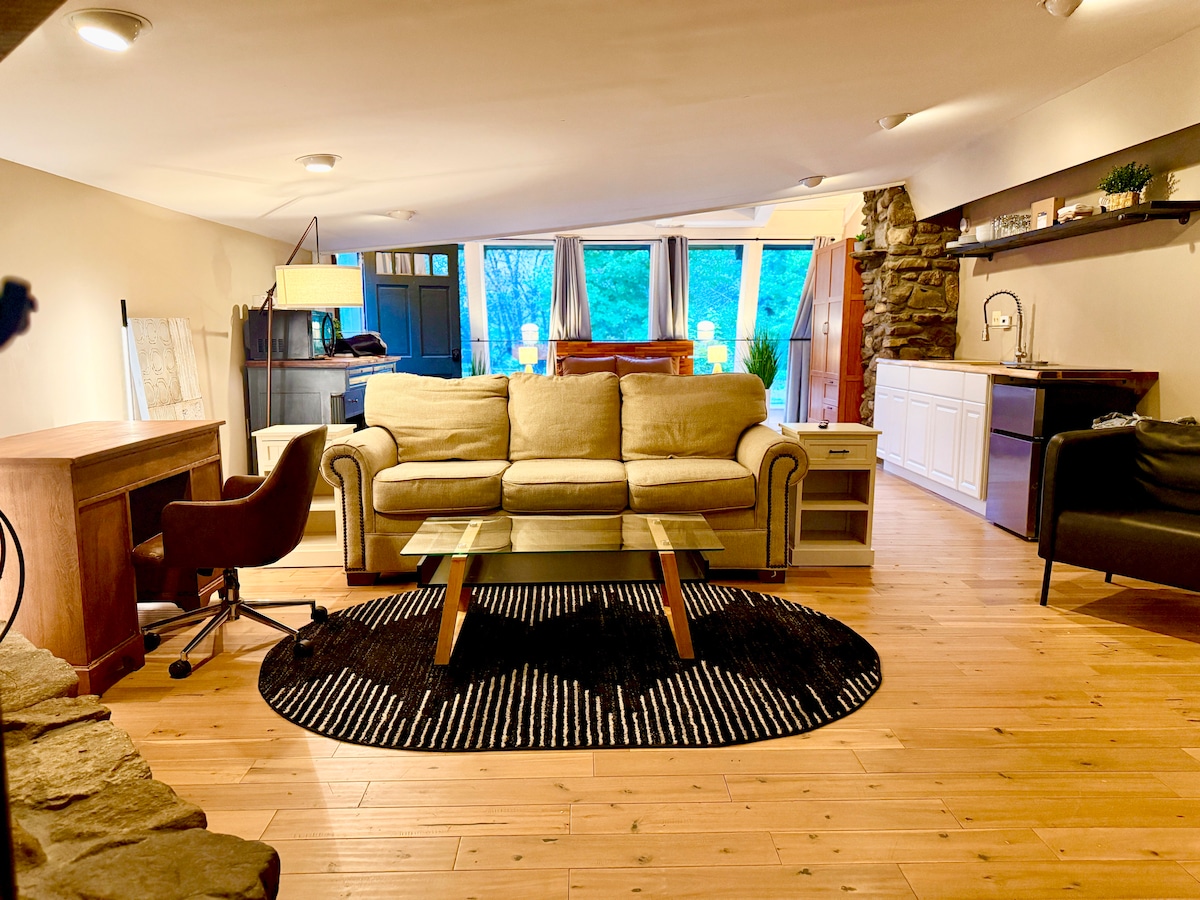 Apartamento tipo estudio totalmente amueblado sobre el garaje de los propietarios con entrada privada. Lote aislado de 5,5 acres rodeado de hermosos bosques. Techos abovedados con escalera al loft con cama tamaño queen. Ventanas grandes y soleadas orientadas al sur con vistas al patio trasero y a los jardines. Los propietarios son una pareja gay casada y relajada que vive en la casa principal con su hija de 5 años. Hogar acogedor para LGBTQ que da la bienvenida a huéspedes amables de cualquier raza, religión, género y orientación. A un minuto de la ruta 125.