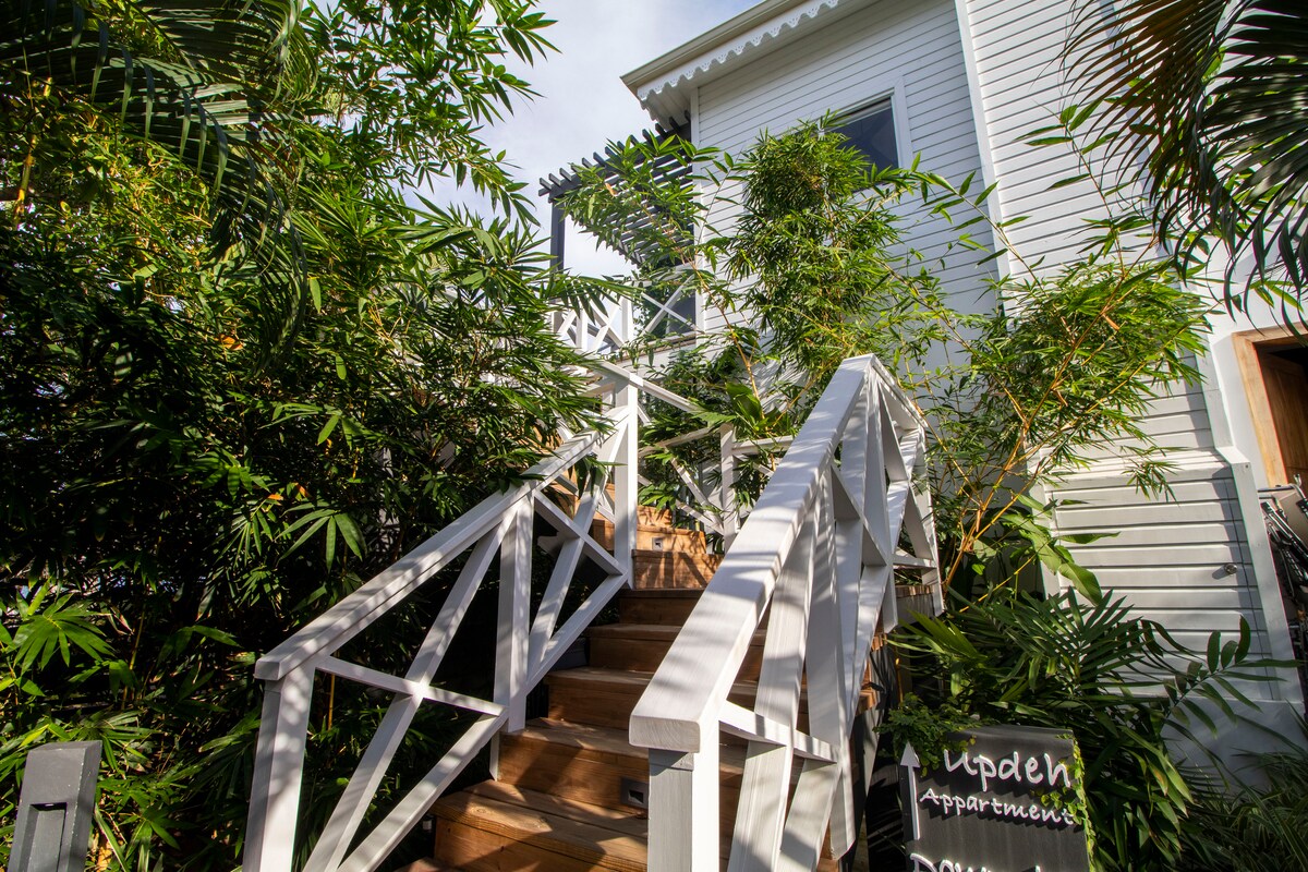 Este es nuestro apartamento estudio en la planta baja en Driftwood Gardens Guesthouse. Disfruta de un patio cubierto con hamaca, mesa de comedor y muebles de patio acolchados. En el interior hay una cama tamaño queen, una pequeña cocina y una ducha de azulejos. La piscina, la terraza y la zona de barbacoa están a solo unos pasos. Ubicación ideal: a 3 minutos a pie de la famosa acera y del mar. El operador turístico de servicio completo y el alquiler de carritos de golf están al lado. La cafetería y la tienda de comestibles están justo al otro lado de la calle. ¡Bicicletas gratuitas y sin servicio de Airbnb ni gastos de limpieza!