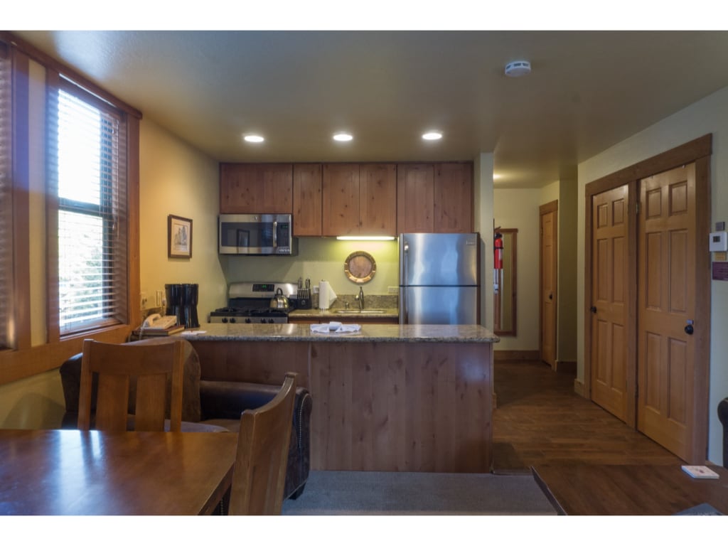 Una suite de 1 dormitorio y 1 baño bien amueblada dentro de Olympic Village Inn. La unidad tiene una cocina (encimera de 2 quemadores, mininevera, microondas, cafetera, utensilios, ollas/sartenes, etc.), el área de la sala de estar es un sofá cama tamaño queen, el dormitorio tiene una cama tamaño queen, conocida como unidad Kitzbuehl. El alojamiento tiene capacidad para 4 personas. Hay wifi gratuito disponible.