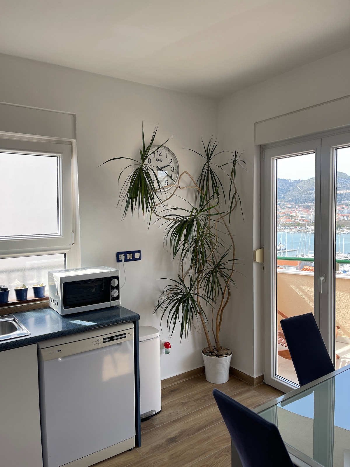Apartamento (2+1 plazas) de 44 m2 en la segunda planta. Un dormitorio doble, baño, además de lavadora y lavavajillas en la cocina, con salón/comedor con sofá, wifi, televisión por satélite, aire acondicionado y una gran terraza con vistas increíbles a todo Trogir. Tienes todo lo que necesitas para unas vacaciones agradables. En este apartamento tienes a Trogir en la palma de tu mano. Puedes admirar la belleza de Trogir durante tu café por la mañana, comidas o noches románticas con una copa de vino y velas.