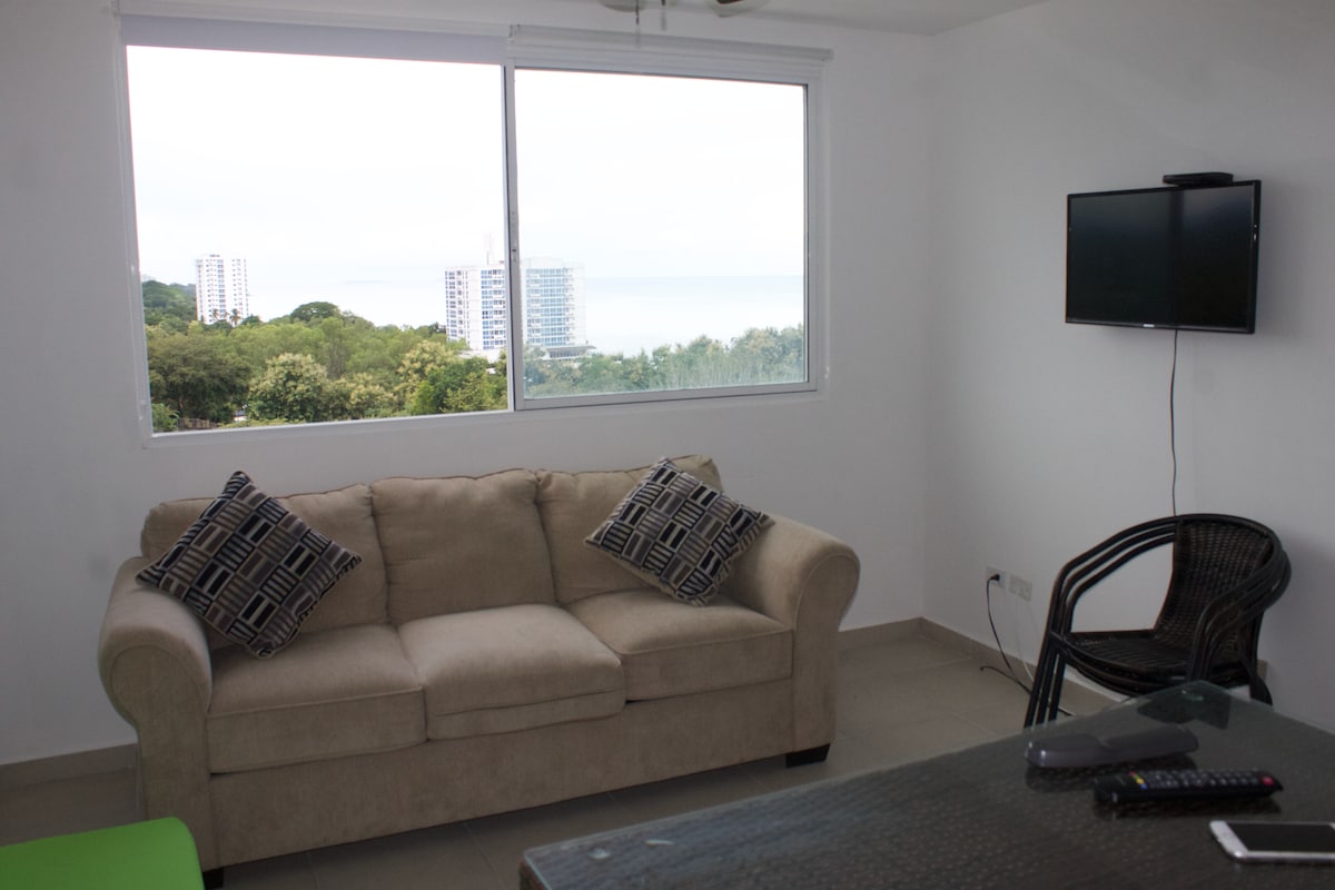 Lindo apartamento: confortable, fresco y relajante... las camas disponibles muy cómodas y con cocina full equipada con lavadora y secadora, ideal para estancias largas. El edificio con 3 piscinas grande y una de niños, cancha de voleibol, área de barbacoa, frente al mar y con acceso a playa. Internet de buena calidad y servicio de cable para estar conectados y teletrabajo, a 15 min de Coronado donde hay supermercados y plazas. Aceptamos Mascotas solo para estadías superiores a 5 días...