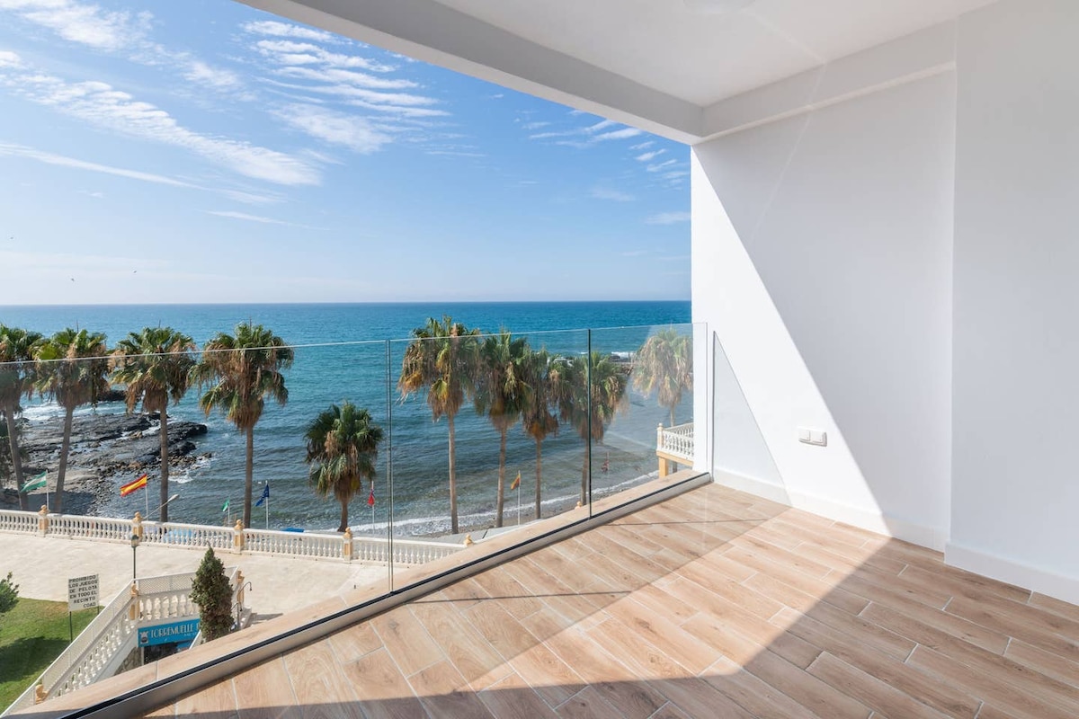 Cozy, bright, entirely renovated quality flat on the front line with sea views from the sunny and large balcony, both rooms and the bathroom. Features his and her shower, full kitchen, 2 tennis courts, 2 swimming pools (1 for children) large gardens, private beach area, free beach beds and private parking. We have a sandy beach with Blue Flag status and direct access to the sea boardwalk. Near Marbella and La Cala with 75+ restaurants and many shops walking distance. Strict cleaning protocols.