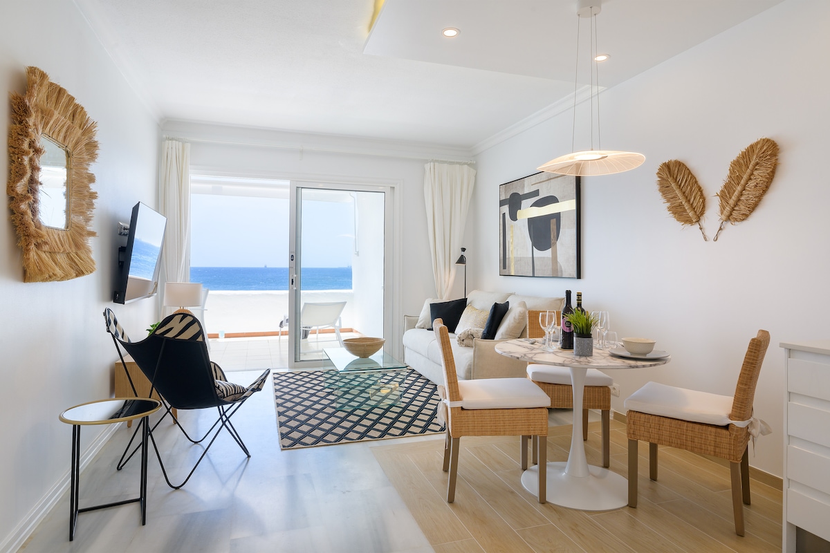 Apartamento exclusivo, muy tranquilo , con vistas al mar. Ideal para TELETRABAJAR, EXCELENTE WIFFI, FIBRA OPTICA, DATOS ILIMITADOS, 1GB. Es amplio, cómodo, muy luminoso, orientado al sur y soleado durante todo el día. Posee una magnifica terraza, con piscina climatizada y vistas espectaculares al mar, al paseo y la playa, dos hamacas y sombrilla de uso privado. SMART Tv 55" Cama y de primera calidad muy confortable. Y SMART Tv 32" Parking gratuito y supermercado en la entrada al complejo.