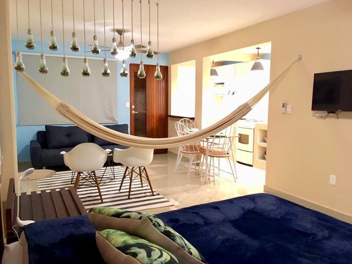 El departamento forma parte de un condominio frente al mar abierto (la playa está a 10 minutos caminando); tiene entrada privada y una vista increíble que da a las zonas comunes de la casa. Cuenta con baño, televisión SMART TV, sofá, cafetera, horno de microondas, lámpara para lectura, aire acondicionado, ventilador de techo, mosquitero, cocina, etc. La casa cuenta con circuito cerrado de 16 cámaras en las zonas comunes.