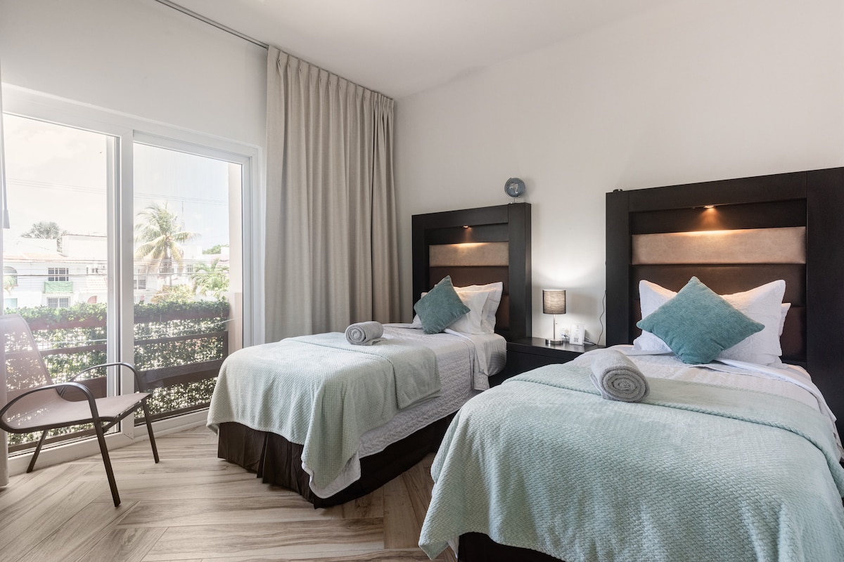 Hermoso alojamiento con entrada independiente y jardín privado que conduce a una cómoda suite con cama queen para dos personas, baño completo y cocina privada. La alberca es el único espacio compartido. Se encuentra en una zona mixta con restaurantes y variedad de tiendas. A 300 metros está la entrada a la Zona Hotelera, donde pasa transporte público hacia la playa, y a 5 minutos la estación ADO, con rutas al aeropuerto y otros destinos turísticos.