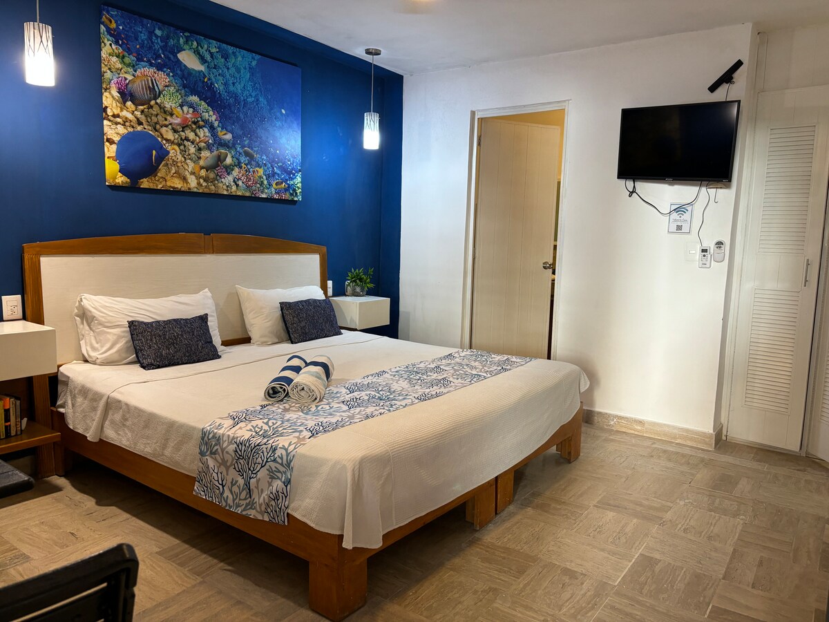Hermoso y Amplio condo frente al mar perfecto para una pareja, cuenta con una cómoda cama KS, TV plana de 45", escritorio cajonera, comedor, cocineta equipada, WiFi, dispensador de agua purificada. Incluimos servicio de limpieza cada tercer día con cambio de toallas. Viaja ligero, aquí te proveemos gratuitamente toallas de Playa!